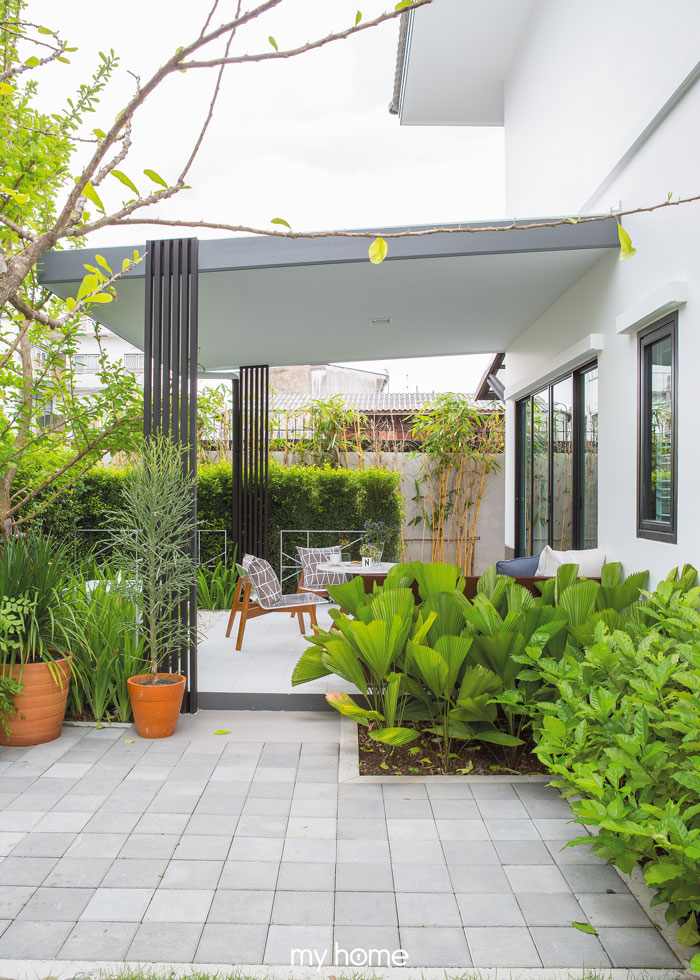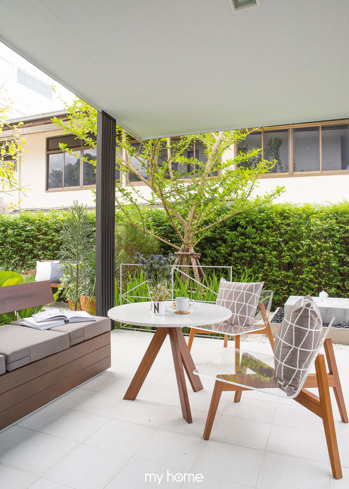 แน่นอนครับว่า ภายในพื้นที่ขนาดจำกัดเช่นนี้ การใส่ฟังก์ชันหรือมุมต่าง ๆ นั้นไม่ใช่เรื่องง่าย แต่ด้วยประสบการณ์ของคุณบอยจึงทำให้สวนแห่งนี้มีรูปแบบที่ลงตัวได้อย่างไม่น่าเชื่อ “เราพยายามใส่ฟังก์ชันให้ครบเหมือนกับบ้านที่มีพื้นที่ขนาดใหญ่ เริ่มจากตัวบ้านบริเวณห้องกินข้าว ที่เมื่อเปิดประตูออกมานอกสวนคุณจะเจอพื้นที่กึ่งเอ๊าต์ดอร์ที่อยู่ติดกับตัวบ้านเป็นเฉลียงยื่นออกไป วางเฟอร์นิเจอร์ลอยตัวให้ปรับเปลี่ยนได้ตามกิจกรรม