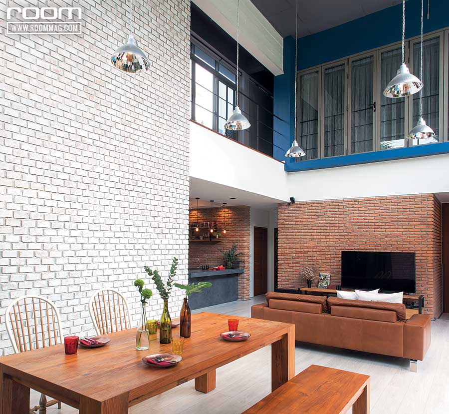 ส่วนรับประทานอาหารโดดเด่นที่ผนังอิฐมอญสีขาวสูงตลอดความยาวสองชั้น การทาสีขาวทับช่วยเบรกความแข็งของสีอิฐธรรมชาติของผนังผืนใหญ่ และช่วยให้ห้องดูสว่างขึ้น อีกทั้งยังเข้ากับสีน้ำเงินของส่วนห้องนอน และสีอิฐธรรมชาติกับปูนเปลือยของครัว ทำให้บ้านลอฟต์หลังนี้ดูเท่ขึ้นเป็นกอง