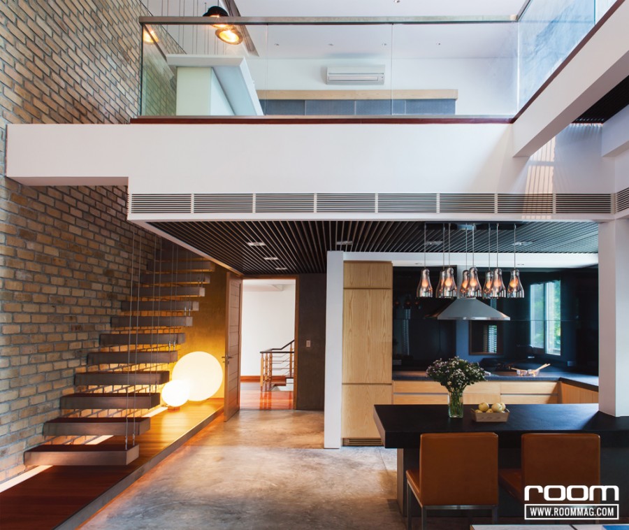 บ้านลอฟต์แบบนิวยอร์กสไตล์ ด้านหนึ่งเป็นผนังอิฐที่มีอิฐหน้าตาไม่เหมือนกันสักก้อน เพราะเป็นการรียูสก้อนอิฐจากหม้อต้มไอน้ำที่ผ่านการใช้งานจริงมาอย่างยาวนาน คงสไตล์ดิบ ๆ โดยการใช้พื้นปูนฉาบขัดมัน ร่วมกับการยกระดับพื้นไม้สำหรับเป็นทางสัญจรขึ้นสู่ชั้นสอง และวางโคมไฟตั้งพื้นเพิ่มความน่าสนใจให้สเปซ