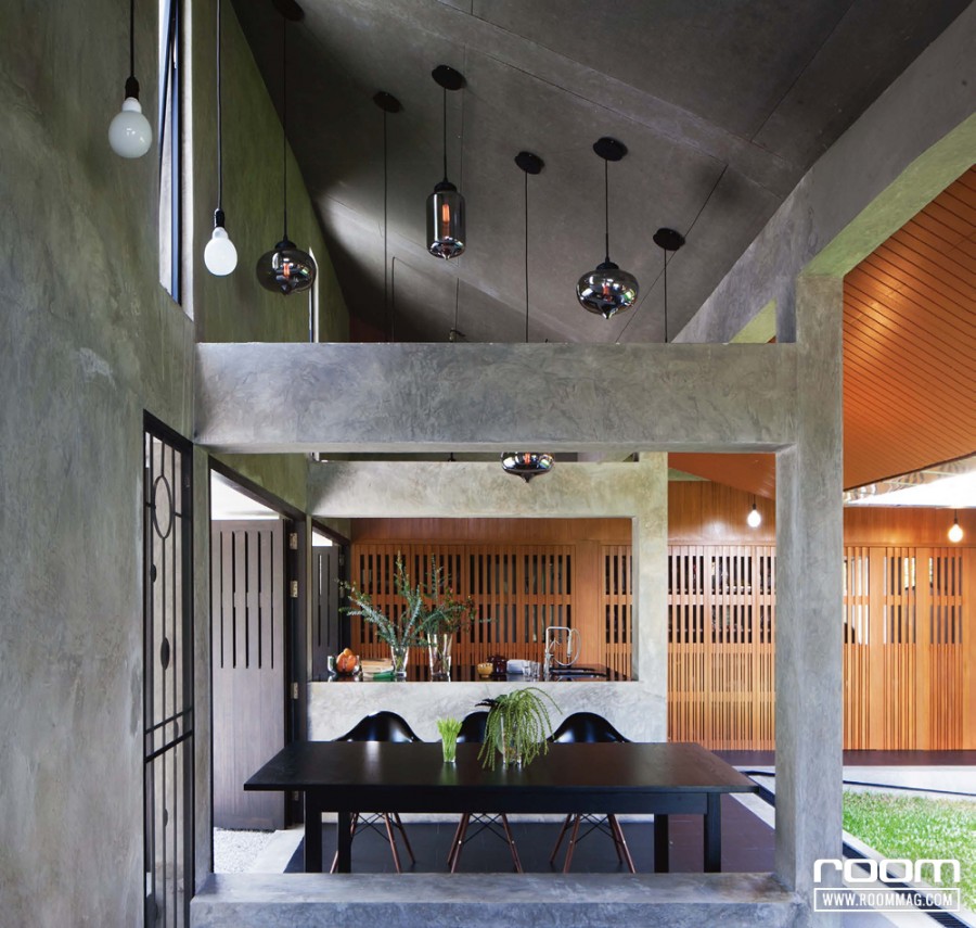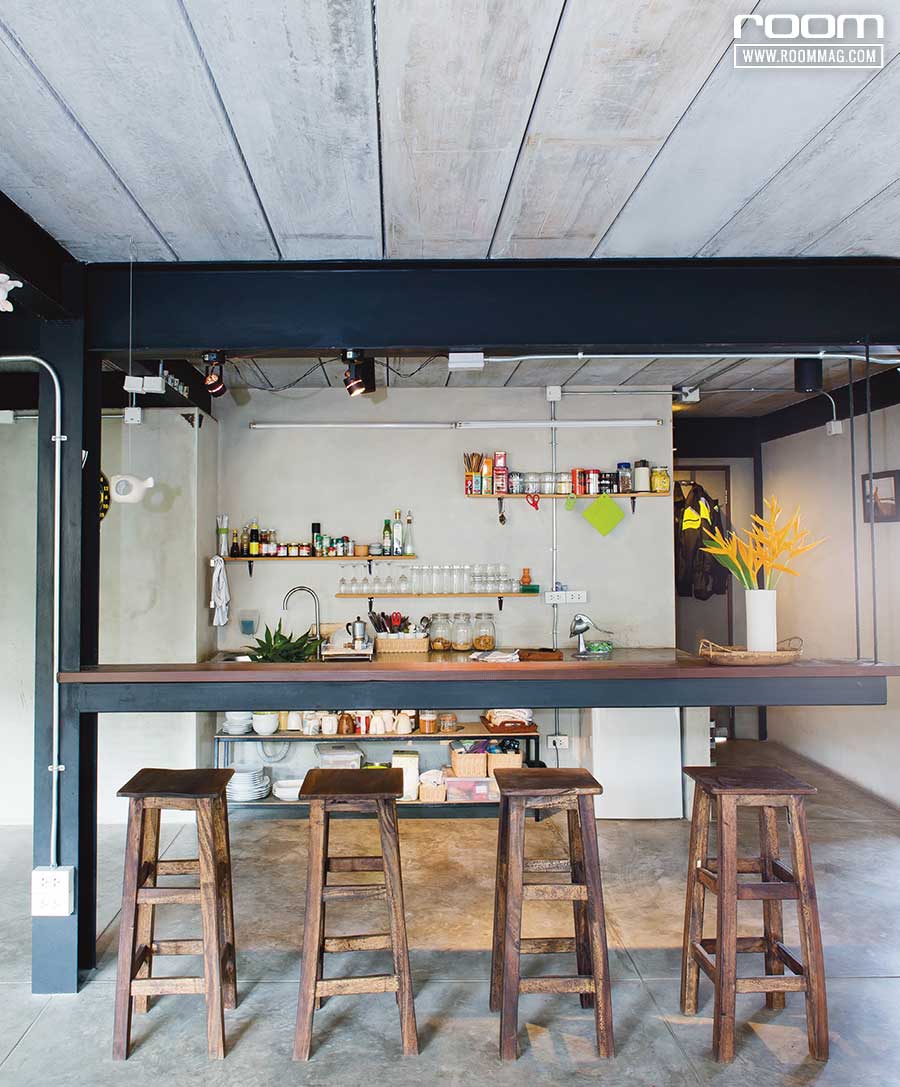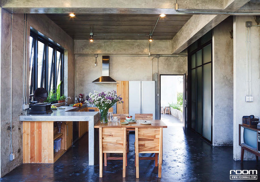 ห้องครัวสไตล์ลอฟต์ กรุตู้และหน้าบานด้วยไม้สลับสี เพื่อให้เกิดมิติเวลามอง ท็อปครัวด้านบนเทคอนกรีตเสริมเหล็กยื่นออกมาจากผนัง จัดวางโต๊ะอาหารไม้ให้ดูกลมกลืนกับหน้าบานซึ่งสั่งทําข้ึนด้วยไม้แบบเดียวกัน
