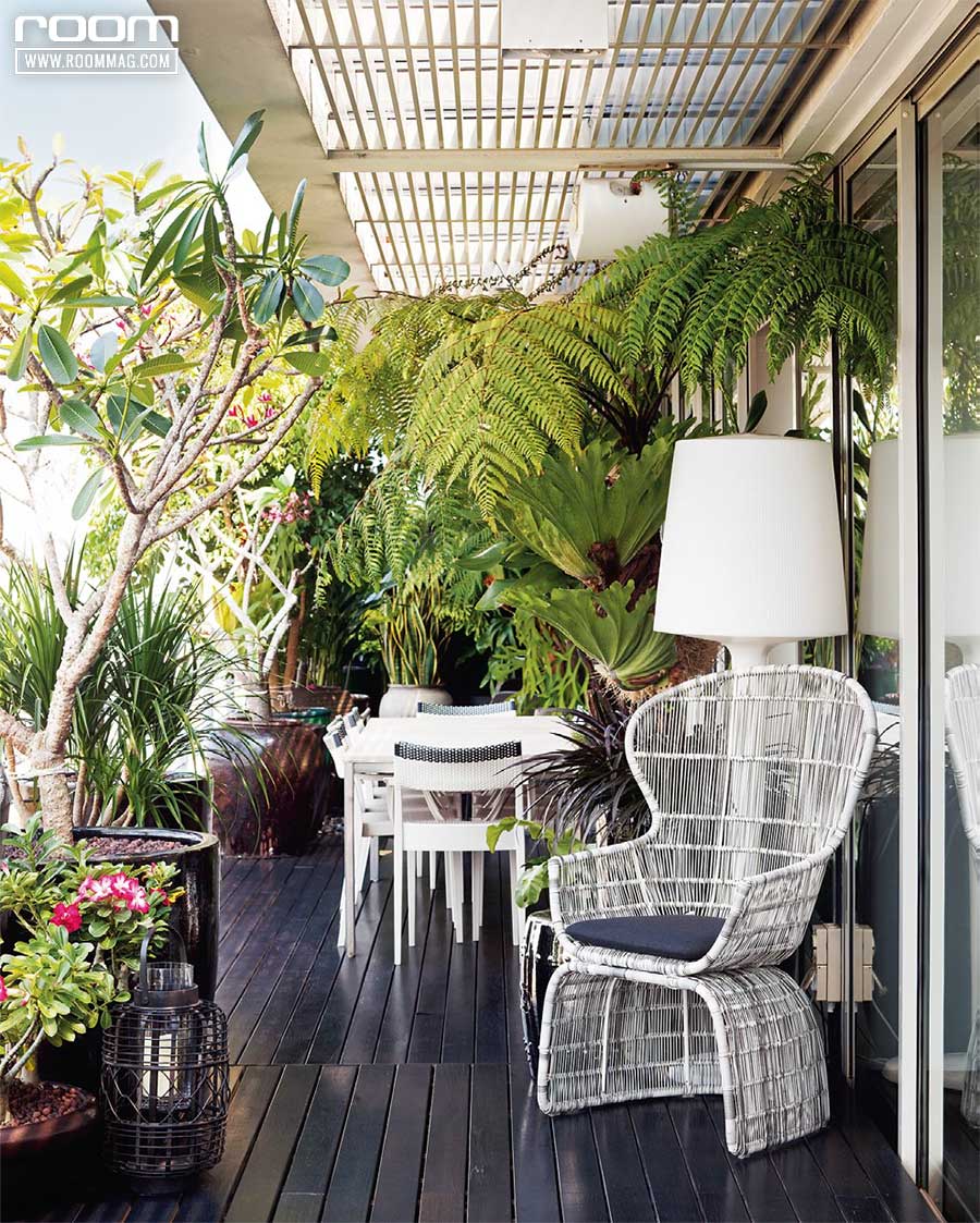 สวนหย่อมบนระเบียงพื้นไม้ กิ่งก้านของต้นไม้ และระแนงเหล็กสีขาวที่แข็งแรงทนทานยังช่วยบังแดดได้ดี ทําให้มุมระเบียงเล็กๆนอกบ้านนี้น่าออกมานั่งพักผ่อน สวนดาดฟ้าที่โดนแดดค่อนข้างจัด แนะนำให้ปลูกพรรณไม้ชอบแดดเต็มวัน เช่น ลีลาวดีหรือชวนชม ที่มีลักษณะลําต้นสวยงามพร้อมให้ดอก สีสันสดใสไม่ต้องดูแลอะไรมาก ไปจนถึงต้นไม้ทนแล้งอย่างลิ้นมังกร กระบองเพชร นอกจากนั้นหากยังต้องการความร่มรื่นจากต้นไม้ที่มีใบสวยงามเพิ่มเติม ลองหาต้นไม้วงศ์เฟินที่สามารถทนแดดได้ ทั้งเฟินชายผ้าสีดา หรือทรีเฟิน
