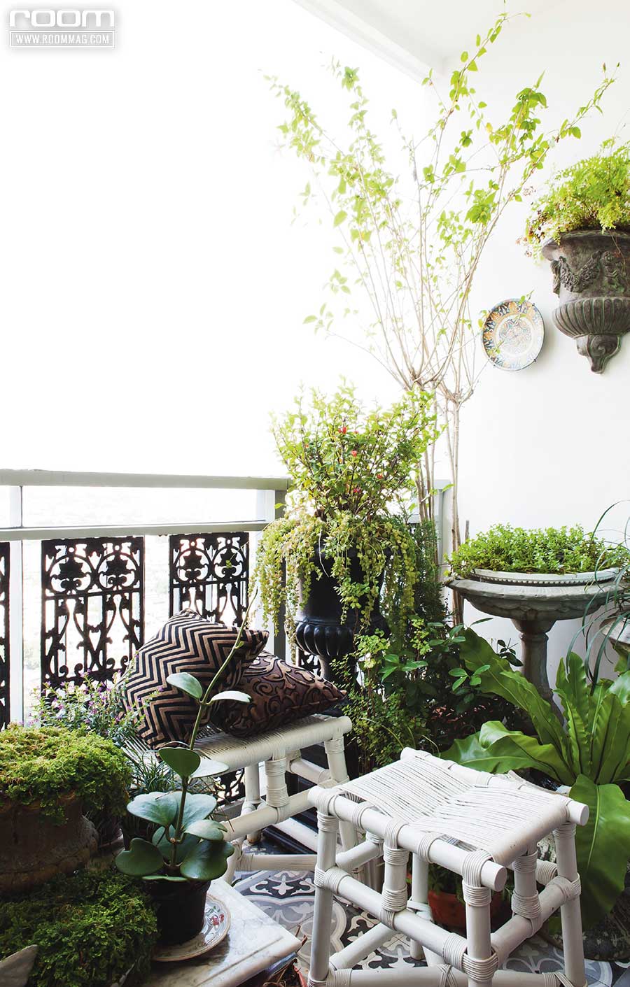 แต่งระเบียงด้านนอกเป็นพื้นที่พักผ่อน ให้แวดล้อมไปด้วยสวนหย่อมอันร่มรื่นและต้นไม้ นานาพรรณบนระเบียงที่เชื่อมยาวถึงกันได้ทั้งหมด ตั้งแต่โถงนั่งเล่นห้องแรกมาจนถึงห้องนอน ที่เป็นเหมือนไฮไลท์ของบ้านที่สามารถสัมผัสกับวิวทิวทัศน์ได้ในทุกวันและทุกๆเวลา