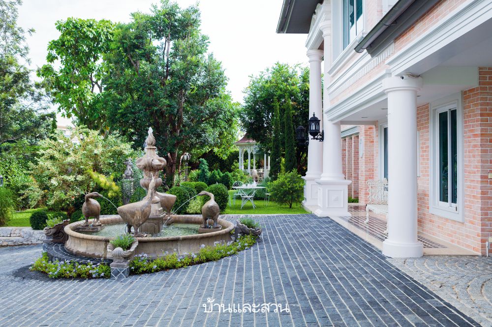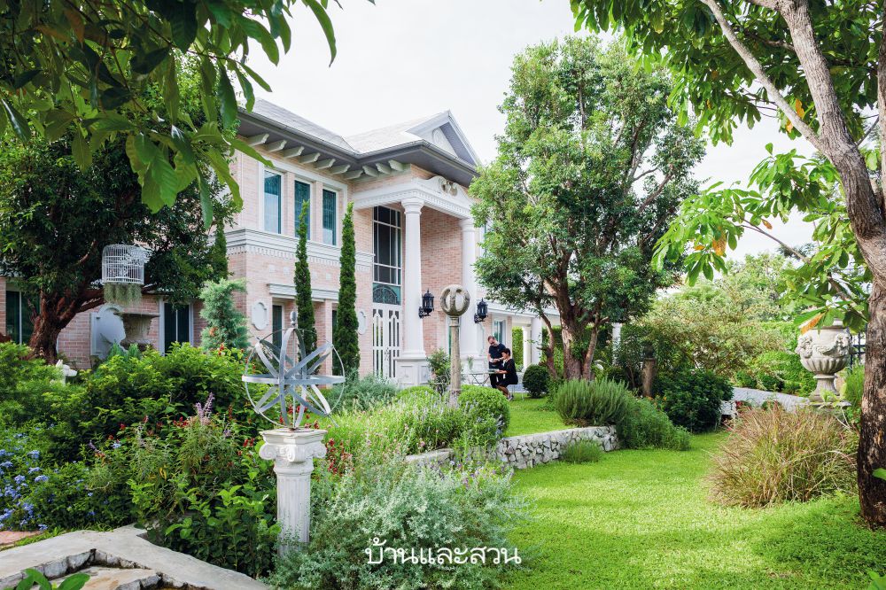 ผ่านการออกแบบของ คุณศักดิ์ เรือง-พร้อม จากสวนลีลา ไร่หญ้าน้องปลื้ม โดยอิงตามความต้องการของเจ้าของและรูปแบบบ้านเป็นหลักโดยคุณสุชาติเล่าให้ฟังว่า “อากาศที่อยุธยาค่อนข้างร้อนมากตอนกลางวัน ความชื้นในอากาศและในดินมีน้อยสวนสไตล์ทรอปิคัลจึงไม่ค่อยเหมาะกับที่นี่ แล้วผมก็เป็นคนชอบความเป็นระเบียบ ชอบอะไรโล่งๆไม่รกตา ดูไม่ซ้ำซากจำเจ มีมุมที่สามารถใช้งานได้หลายมุม ทั้งมุมสำหรับรับแขก นั่งเล่นหรือสังสรรค์ได้ และมุมที่เงียบสงบ” ทันทีที่เข้ามาในสวนก็สะดุดตากับบ่อน้ำพุขนาดใหญ่ที่รับกับขนาดของตัวบ้าน รายล้อมด้วยลานขนาดกะทัดรัดปูกระเบื้องหินเป็นทางสำหรับขับรถไปเก็บยังโรงจอดรถและสามารถเดินเล่นได้ลักษณะคล้ายลานโล่งหน้าคฤหาสน์ในประเทศฝั่งตะวันตก ถัดไปด้านข้างเป็นเนินดินถมใหม่ซึ่งจัดเป็นสวนที่ยังคงเชื่อมต่ออารมณ์สไตล์ยุโรปอยู่แต่ไม่ทิ้งความร่มรื่นแบบสวนเมืองร้อนเอาไว้โดยเน้นไปที่การเลือกใช้ไม้ใบเล็กและพรรณไม้พื้นเมืองทดแทนไม้เมืองหนาว แบบสวนยุโรป