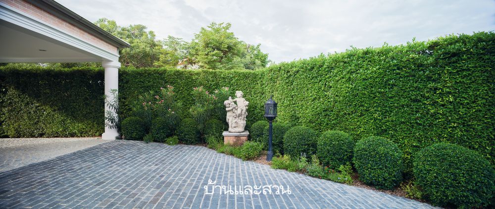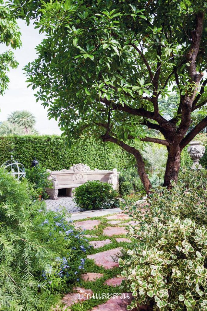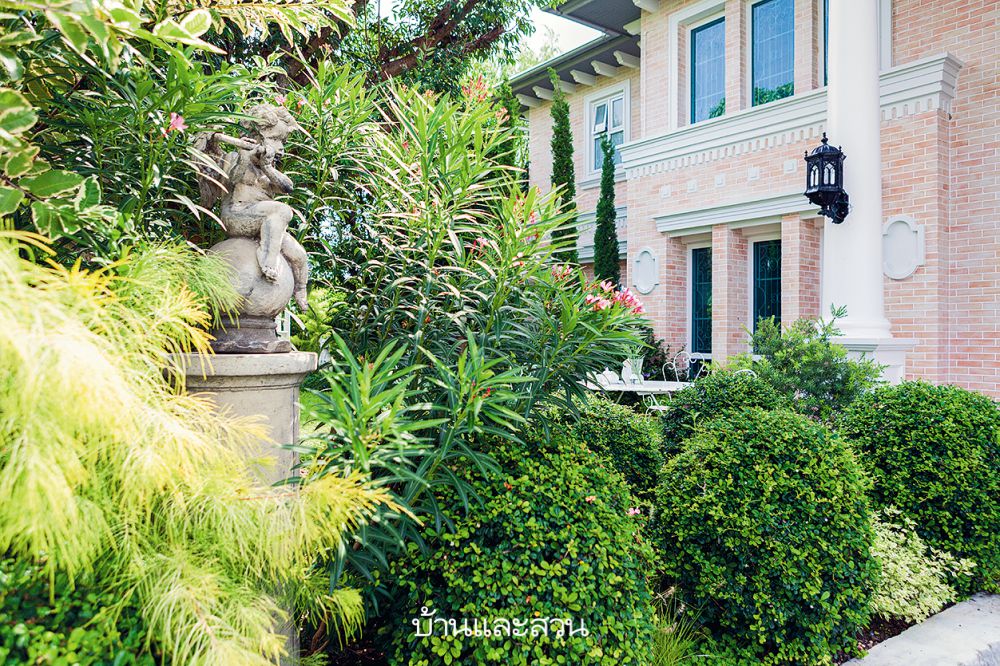 เพื่อความสะดวกในการดูแลและไม่เป็นภาระแก่เจ้าของบ้าน ทุกมุมในสวนยังแทรกด้วยงานประติมากรรมและมุมนั่งเล่นซึ่งเกือบทั้งหมดเป็นสินค้านำเข้าจากประเทศฝรั่งเศสเพื่อให้สวนมีเอกลักษณ์ไม่เหมือนใคร และให้อารมณ์เหมือนสวนยุโรปมากที่สุด คุณศักดิ์ นักจัดสวน เล่าบ้างว่า “ผมเน้นออกแบบสวนที่สามารถใช้ประโยชน์ได้จริง ไม่ว่าจะเดินเล่นหรือมีมุมให้นั่งพัก ไม่มีจุดใดเป็นจุดบอดหรือไม่มีการใช้งาน ผมจะสังเกตจากพฤติกรรมของตัวเองขณะสำรวจพื้นที่ว่าเราอยากหยุดเดินบริเวณจุดใดบ้างและสอบถามผู้ใช้สวนเป็นหลัก รวมถึงเก็บรายละเอียดในทุกมุม เมื่อเจ้าของมองออกมาจากภายในบ้านก็ยังสามารถชื่นชมสวนได้ นี่เป็นสไตล์การจัดสวนของผมครับ”