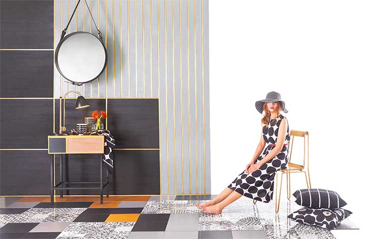 หนึ่งโจทย์ท้าทายของการปูพื้นกระเบื้องที่มีลวดลาย คือจะทําอย่างไรไม่ให้ดูเยอะจนตาลาย เรามีวิธีจัดการง่าย ๆ โดยใช้กระเบื้องมีลวดลายปูคละกับกระเบื้องสีพื้นไม่มีลายในเฉดเดียวกัน (ซึ่งควรเป็นเฉดสีท่ีเช่ือมโยงกับลวดลายหลัก) เหมือนในตัวอย่างนี้ที่เลือกใช้กระเบื้องในโทนสีขาว เทา และดํา เพื่อช่วยเบรกอารมณ์ หรือจะเพิ่มกระเบื้องเฉดสีที่ดูคอนทราสต์อย่างสีทองเข้าไปผสมเพิ่มความหรูหราก็ทันสมัยข้ึน