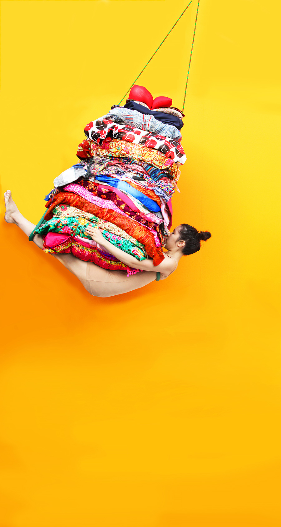 กวิตาใช้ตัวเองเป็นกระสวยทอผ้ากับเครื่องปั่นด้ายในผลงาน “Shuttle” & “Performing Textiles”