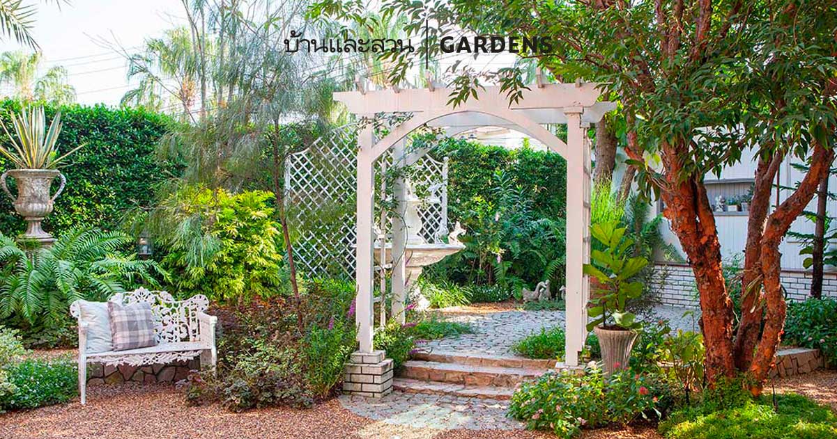 “ รอบแรกทีเข้ามาจัดสวน ทางเจ้าของบ้านอยากให้จัดเป็นสวนสไตล์อังกฤษหวาน ๆ ดูโล่งสะอาดตา และสามารถดูแลรักษาได้ง่าย แต่มีข้อจำกัดหลัก ๆ คือบริเวณรั้วกำแพงที่ถูกปิดทับไว้ด้วยระแนงไม้แผ่นใหญ่อยู่แล้ว ผมจึงต้องเริ่มจากการเปลี่ยนผนังให้เป็นสีขาวเพื่อให้ดูโปร่ง สะอาด แล้วจึงเติมรายละเอียดต่าง ๆ อย่างงานตกแต่งลงไป จากนั้นเลือกใช้ไม้ใหญ่อย่าง เสม็ดแดง มะฮอกกะนี และทองกวาว มาแผ่กิ่งก้านให้ร่มเงาแก่พื้นที่ ส่วนไม้ระดับกลางและระดับล่างจะเน้นไม้ดอก เพื่อเพิ่มบรรยากาศให้ดูหวานอ่อนช้อยมากยิ่งขึ้น ”