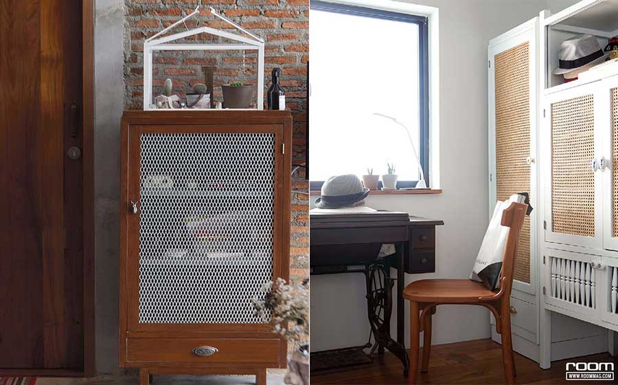 ของเก่าหลายช้ินเมื่อนํามาประยุกต์ ปรับนิดเปลี่ยนหน่อยก็ดูโก้เก๋ใช้งานสะดวกข้ึน อย่างตู้ไม้คู่บ้านนํามาทําความสะอาดพร้อมเปลี่ยนมือจับเสียใหม่ ใช้เก็บของจุกจิกให้เป็นระเบียบอย่างง่ายดาย หรือตู้กับข้าวเก่ามาทําความสะอาดและทาสีขาวทับลงไป เหมาะใช้เป็นตู้เก็บเสื้อผ้าเครื่องประดับ เพราะบานตู้เป็นหวายจึงไม่อับชื้น ระบายอากาศได้ดี