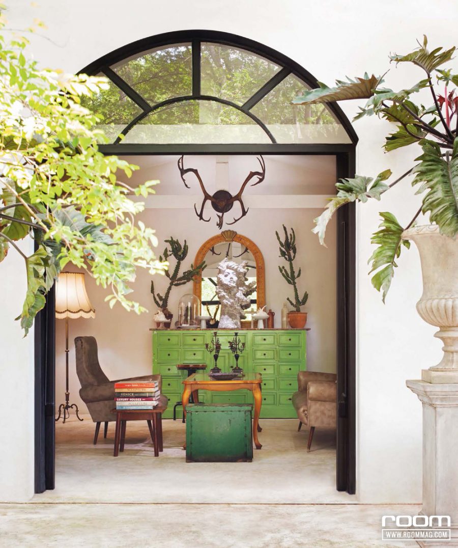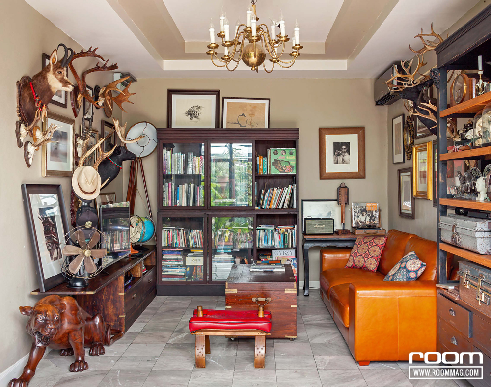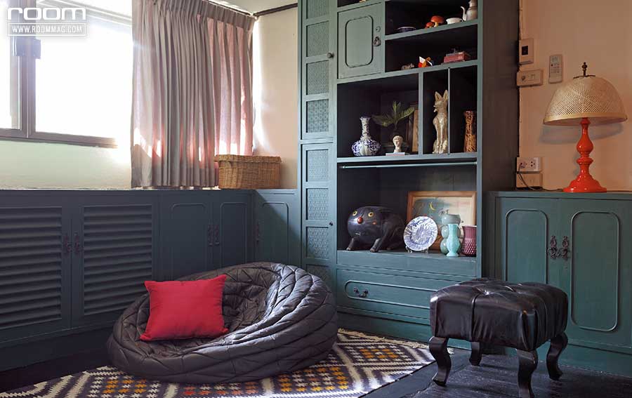 ตู้บานใหญ่ซึ่งเป็นชื่นมาสเตอร์พีซทำสีเขียวเข้มเฉดเดียวกับหีบสร้างจุดนำสายตา ตัดกับของตกแต่งสีน้ำตาลเข้มอย่างโซฟาและเขาสัตว์ ร่วมกับเฟอร์นิเจอร์ในห้องกลมกลืนกันด้วยรูปทรงจากเส้นตรงและเส้นโค้งที่ลดทอนลงให้ลุคโดยรวมดูเท่