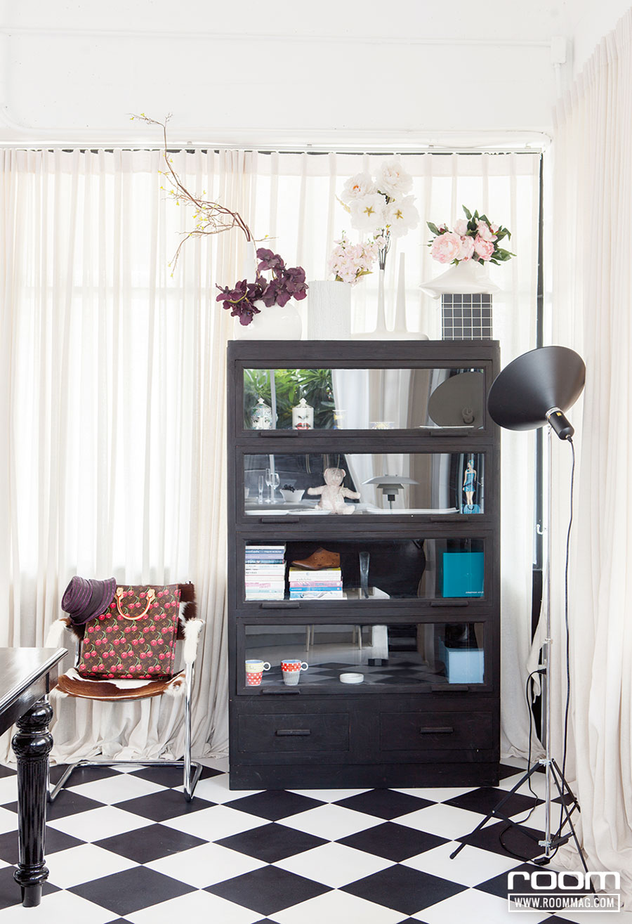 ตู้โชว์ไม้บานกระจกทาสีใหม่ให้เป็นสีดํา ช่วยให้ของสะสมที่อยู่ภายในโดดเด่นขึ้น รวมถึงตัวตู้ไม้เองก็กลมกลืนกับโทนสีขาว-ดำของบ้านเช่นกัน