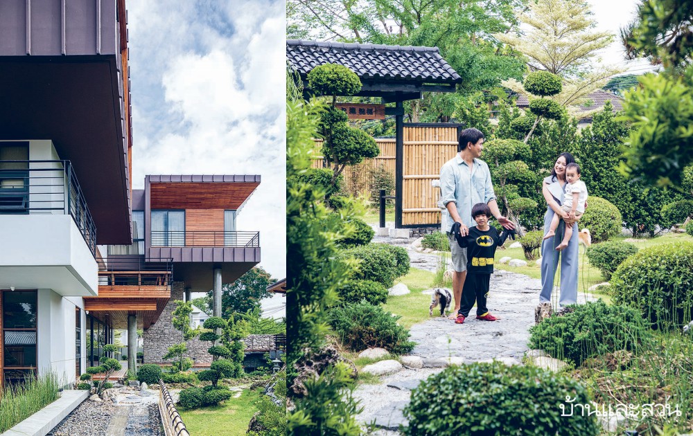 เดินชมบ้านมาจนถึงเวลาบ่ายแก่ๆ คุณบิ๊กกับคุณบีก็เริ่มชวนเด็กๆ ออกมาเดินเล่นรับลมริมบ่อปลาคาร์ฟ แล้วก็เดินลงไปตามแผ่นหินนำทางไปสู่สวนญี่ปุ่น พื้นที่สีเขียวขนาดใหญ่ซึ่งเป็นสนามวิ่งเล่นให้เด็กๆ ได้อย่างดี พอๆ กับที่สร้างความสดชื่นในมุมมองของความสงบนิ่งแบบที่ทั้งคู่ต้องการ สมดุลที่พอดิบพอดีแบบนี้เองที่ทำให้พื้นที่ขนาดกว้างนี้อบอุ่นและไม่อ้างว้างจนเกินไป