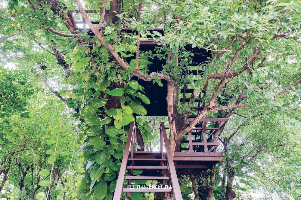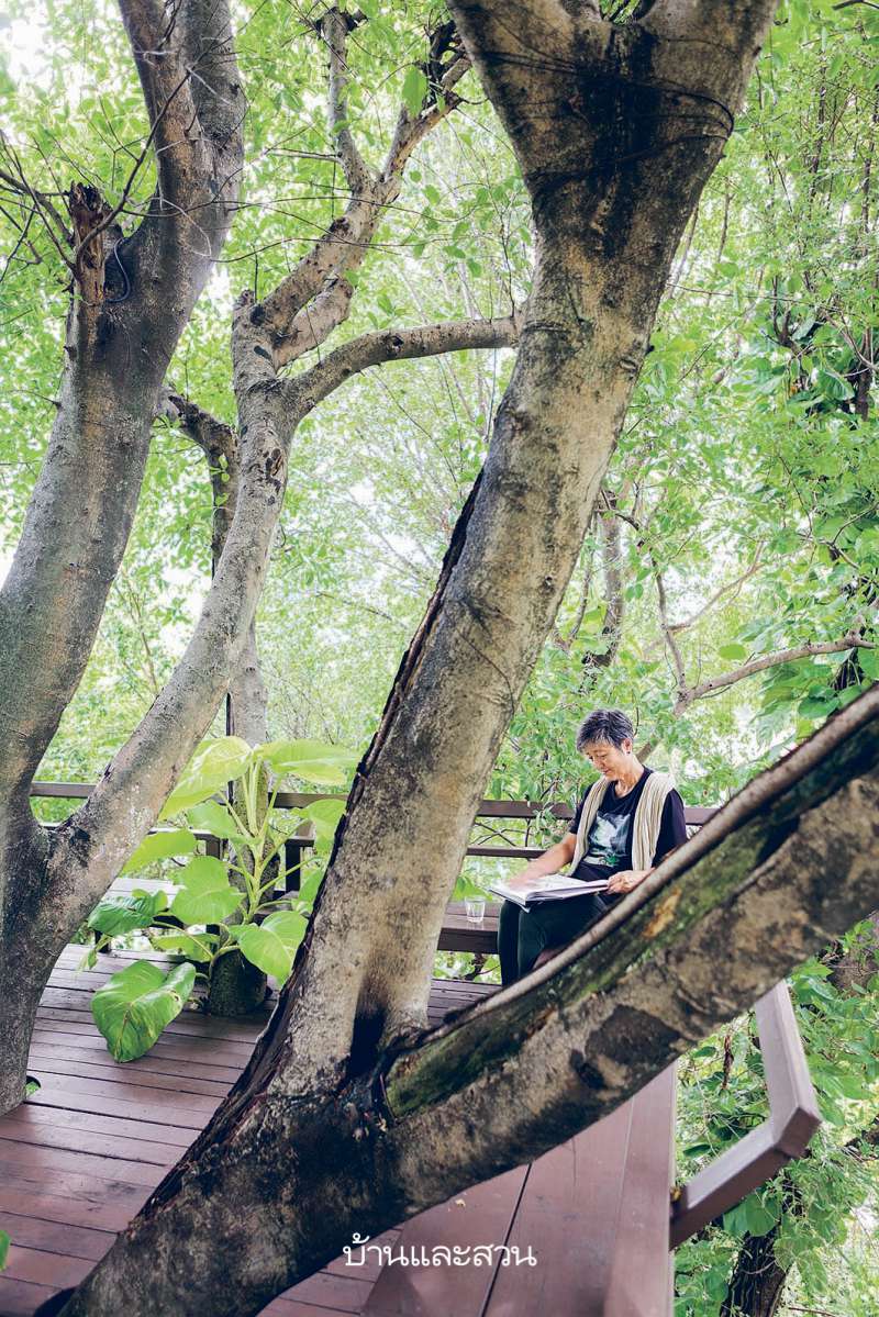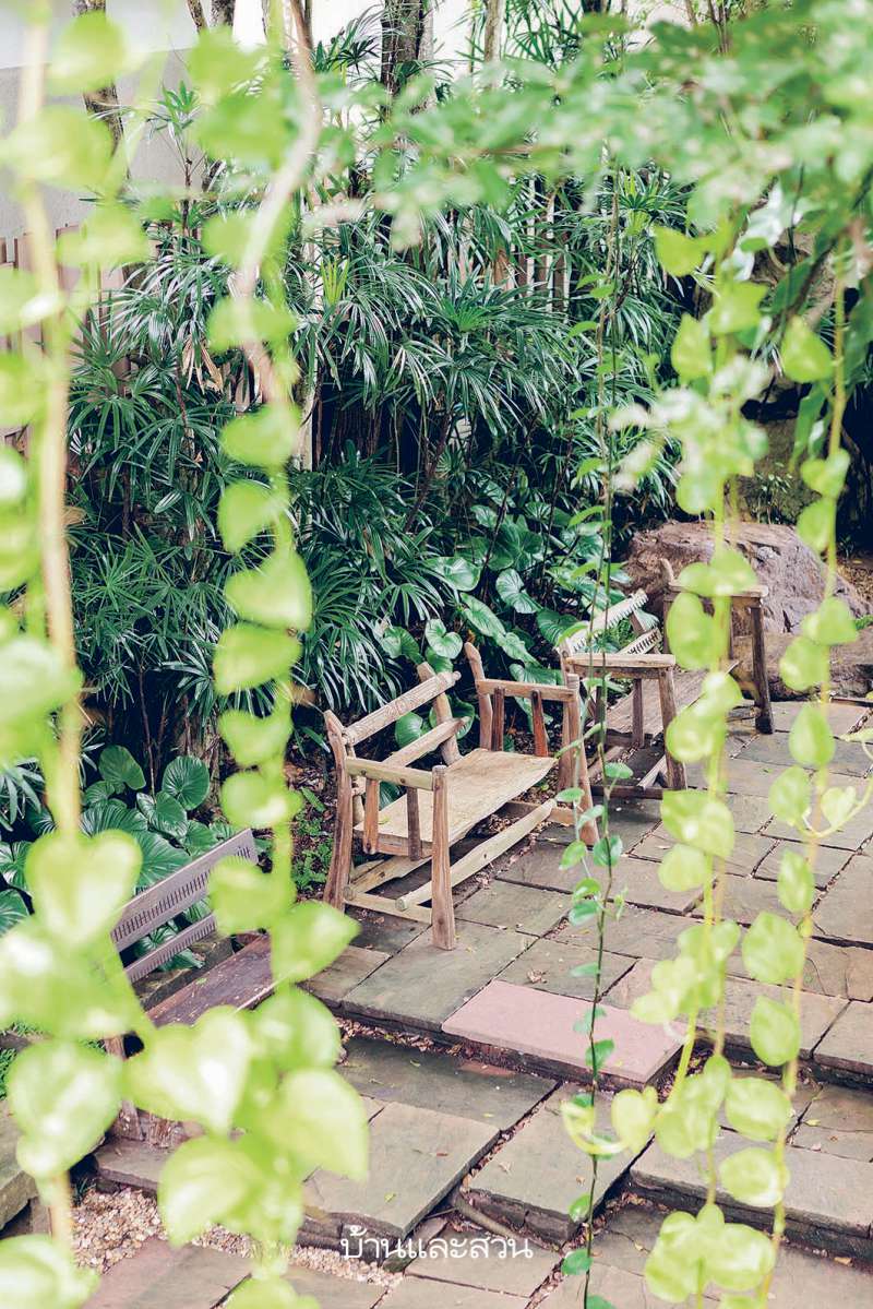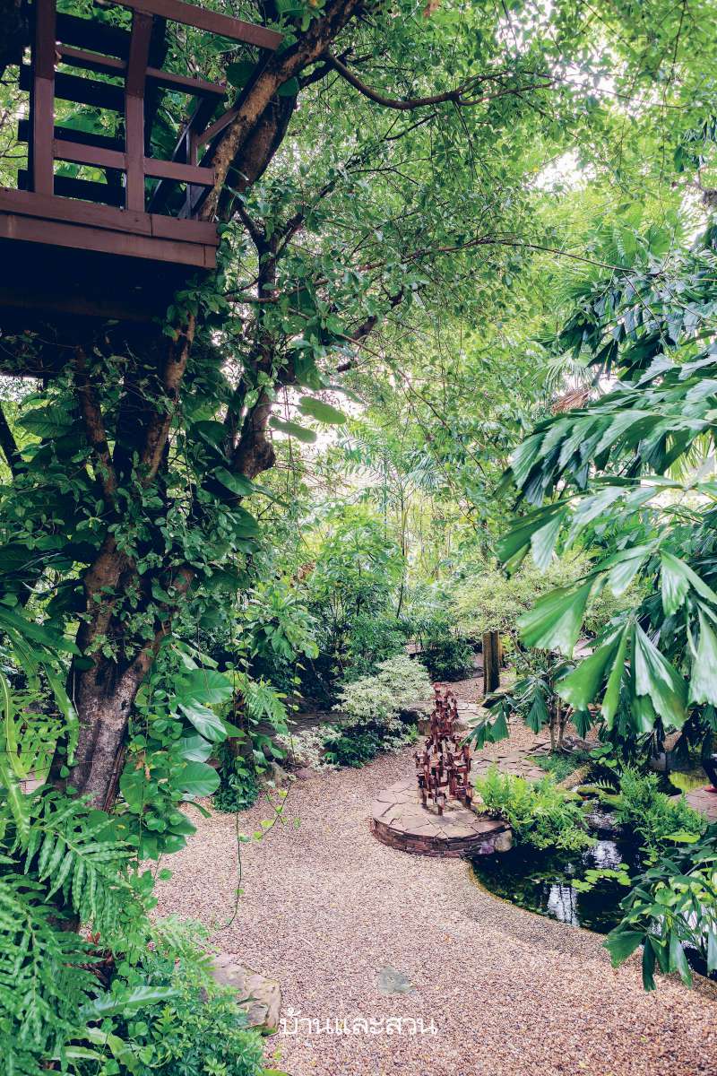 ทางเดินพื้นโรยกรวดแม่น้ำสีน้ำตาลพาเราเดินลัดเลาะไปตามส่วนต่างๆของสวนที่ร่มรื่นจากร่มเงาของต้นไม้ใหญ่ซึ่งล้วนแต่เป็นพรรณไม้พื้นถิ่นของบ้านเรา สระน้ำที่ค่อยๆลาดลึกลงไปเป็นแอ่งประดับด้วยหินขนาดใหญ่แทรกไปกับพรรณไม้หลากหลายขนาดอย่างลงตัวรับกับมุมมองจากพื้นที่ใช้งานอย่างสนามหญ้า เรือนกระจก ลานนั่งเล่นและภายในบ้าน โดยมีน้ำตกขนาดเล็กที่ไหลมาจากลำธารอ้อมยาวผ่านตัวบ้านมาจากน้ำตกหลังบ้านช่วยเพิ่มความมีชีวิตชีวาและสัมผัสจากเสียง นอกจากนั้นยังมีลายละเอียดหรือของตกแต่งอื่นๆแทรกอยู่ภายในสวนที่น่าสนใจไม่แพ้กันทั้งงานประติมากรรมหรือบ้านต้นไม้ขนาดใหญ่ซึ่งมาจากฝีมือและจินตนาการของคุณพิชัยเองด้วยเช่นกัน