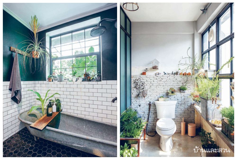 หลายคนมักนำต้นไม้เข้าไปปลูกในห้องน้ำ เนื่องจากเข้าใจว่าต้นไม้กับน้ำเป็นของคู่กัน ซึ่งก็เป็นความคิดที่ไม่ผิด แต่การปลูกต้นไม้ในห้องน้ำ นอกจากน้ำแล้วยังจำเป็นต้องมีแสงแดดในปริมาณที่พอเหมาะอีกด้วย เพื่อช่วยลดความชื้นในห้องน้ำ ซึ่งเป็นสาเหตุของการสะสมของเชื้อโรคและเชื้อราแล้วยังช่วยให้ต้นไม้เจริญเติบโตได้ดี แต่การทำช่องแสงในห้องน้ำจำเป็นต้องคำนึงถึงความเป็นส่วนตัวด้วย ช่องแสงส่วนใหญ่จึงมาในลักษณะหน้าต่างที่ติดตั้งอยู่สูงกว่าหน้าต่างแบบทั่วไปและเว้นขอบวงกบไว้มากกว่าปกติ เพื่อไว้สำหรับวางกระถางต้นไม้ได้