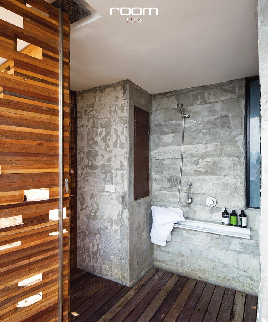 เบรกความดิบของคอนกรีตขัดมันด้วยสีสันสดใสจากประตูบานผลักเหล็กไม่เต็มบานสีแดงที่ออกแบบมาเป็นพิเศษ เหมาะกับห้องน้ำของห้องส่วนตัว