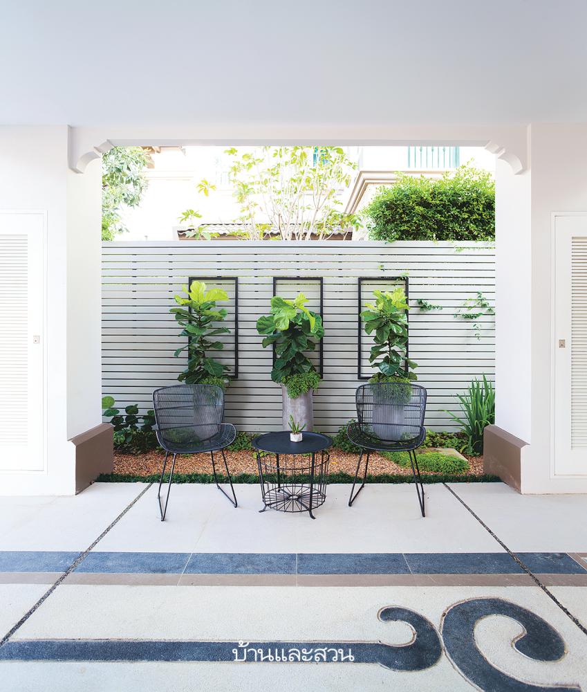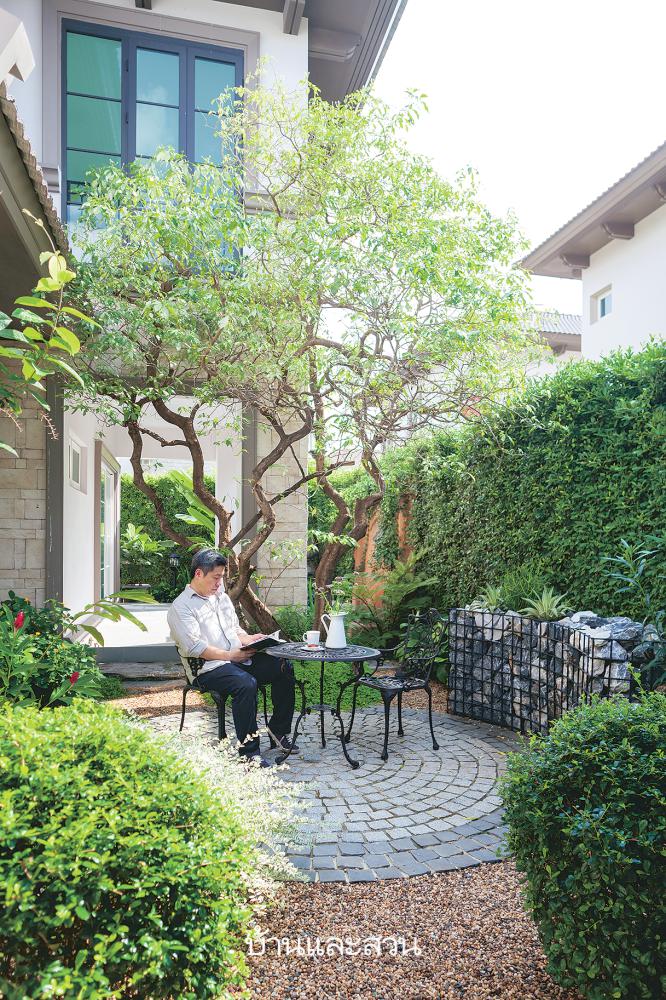 “ผมชอบสวน ซึ่งเป็นเหตุผลให้เลือกซื้อบ้านเดี่ยว และสามารถชวนเพื่อนหรือพี่ป้าน้าอามาจัดงานเลี้ยงสังสรรค์เล็กๆ ที่บ้านได้ คุณศักดิ์จึงออกแบบลานวงกลมตรงกลางมาให้ ซึ่งใช้ประโยชน์ได้เยอะ อย่างตอนเช้าผมมานั่งจิบกาแฟ กลางวันผมก็มาใช้พื้นที่ในบ้าน แล้วมองออกไปเห็นภาพสวนที่สวยงาม ตกกลางคืนก็ชวนที่บ้านมาทำบาร์บีคิวกินกันได้อีก และยังมีสวนครัวสำหรับภรรยาโดยเฉพาะ พอดีเขาชอบทำอาหารและขนม เลยขอไว้เป็นพิเศษ ตอนแรกจะทำเป็นสวนผนัง แต่ดูแลยาก ก็เลยทำเป็นชั้นกระบะ ดูสวยไปอีกแบบ” คุณสุธีเล่า