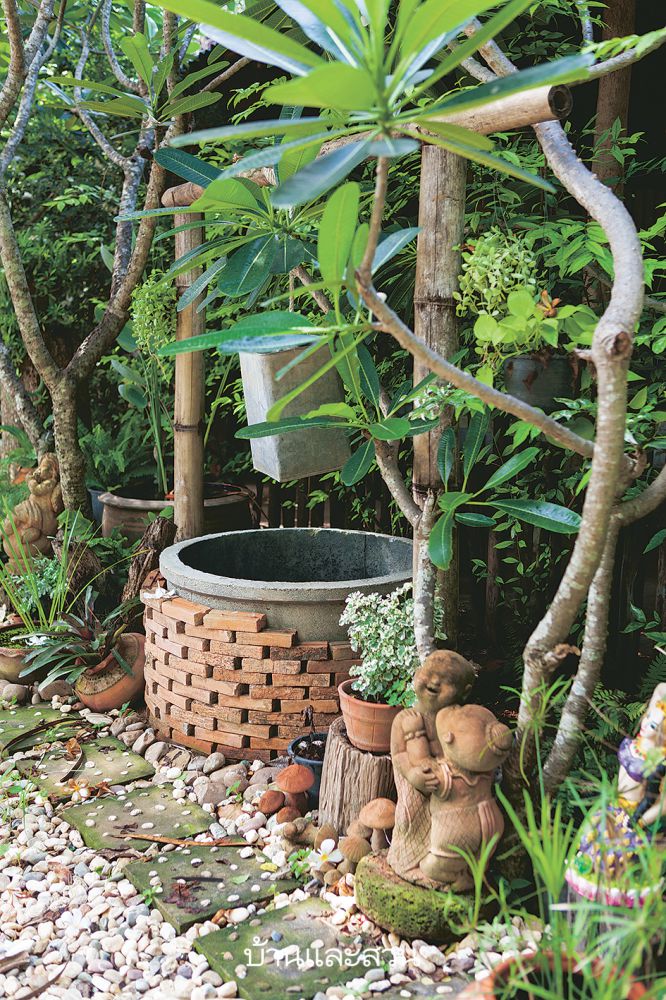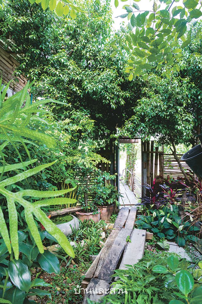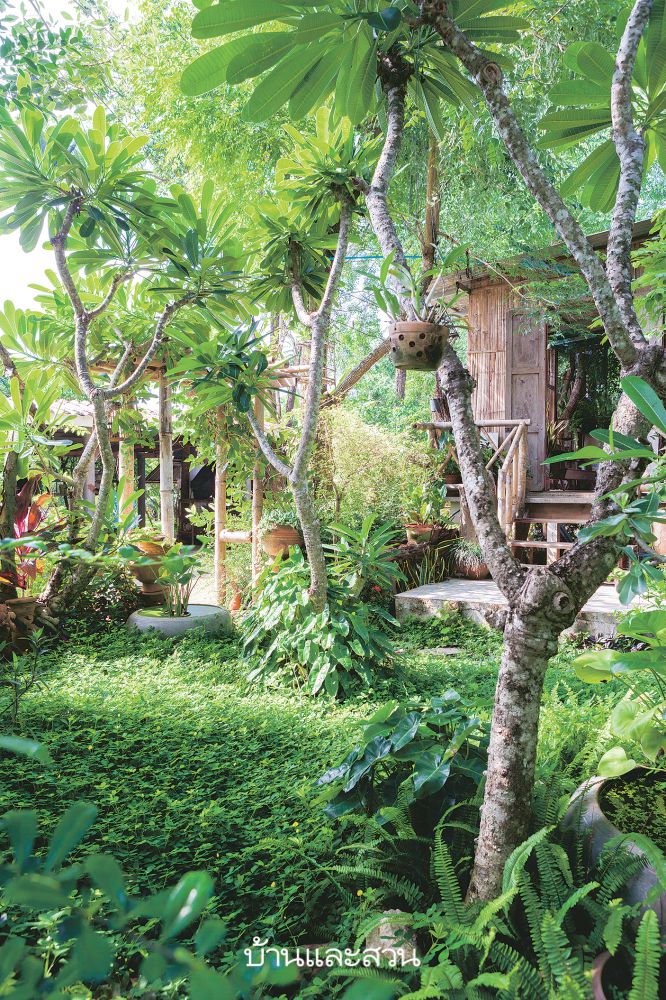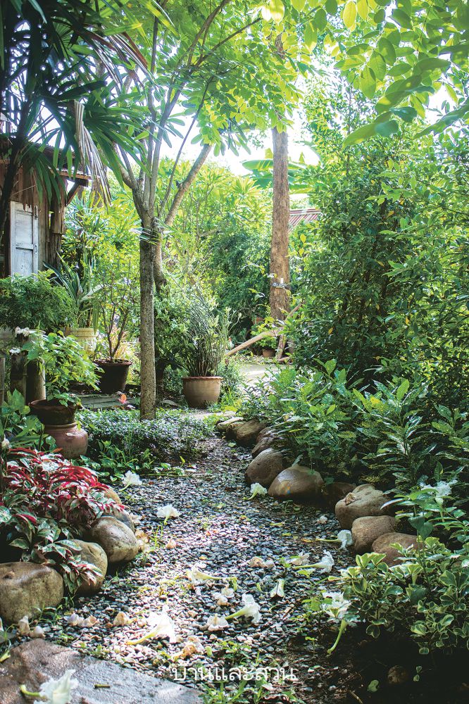 “การออกแบบจัดสวนของผมอาจต่างจากนักจัดสวนมืออาชีพ ผมใช้วิธีจินตนาการเอา ดูจากพื้นที่ จากต้นไม้เดิมที่มี ดูบริเวณโดยรอบ แล้วนึกภาพว่าตรงนี้ควรเป็นอย่างไร ตรงนั้นควรมีอะไร เรามีอะไรอยู่บ้าง คิดไว้คร่าวๆ ว่าจะทำอะไร แล้วก็ลงมือทำเลย ไม่ได้เขียนแปลนออกแบบเหมือนนักจัดสวนอาชีพ ต้นไม้ส่วนใหญ่ก็หาจากในพื้นที่ เพาะขยายพันธุ์เอง ปลูกเองทุกต้น ต้นไม้ค่อนข้างจะหลากหลาย โดยส่วนตัวชอบไม้ไทยๆ ไม้ดอกหอมๆ ก็มีปลูกปนอยู่ทั่วไป อย่างลั่นทมและปีบ แรกๆ ก็มีขัดกับลูกบ้าง เพราะลูกชอบไปอีกแบบหนึ่ง แต่เราเป็นนักจัดสวนบางทีเห็นมันก็ขัดๆ ทำแบบนั้นไม่เหมาะ สรุปคือลูกๆ เลยตามใจให้พ่อทำเต็มที่อย่างที่ชอบ โดยเขาคอยช่วยจัดการดูแลพวกไม้กระถางแขวน หรือต้นไม้เล็กๆ ที่ตกแต่งตามโต๊ะ