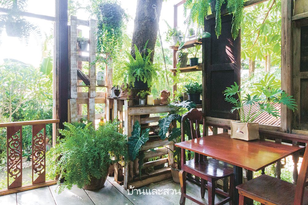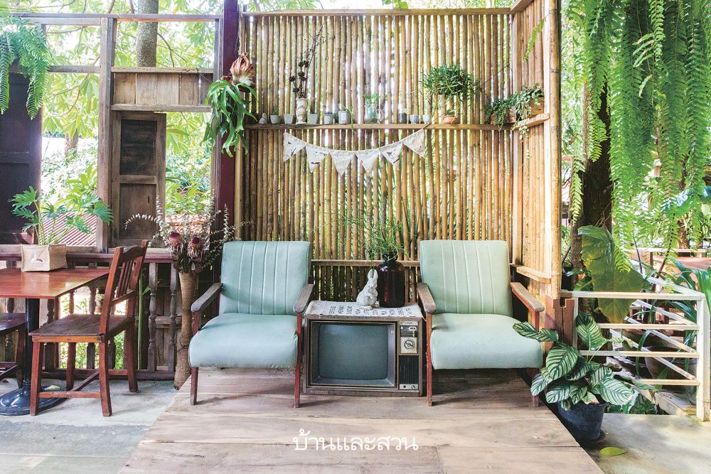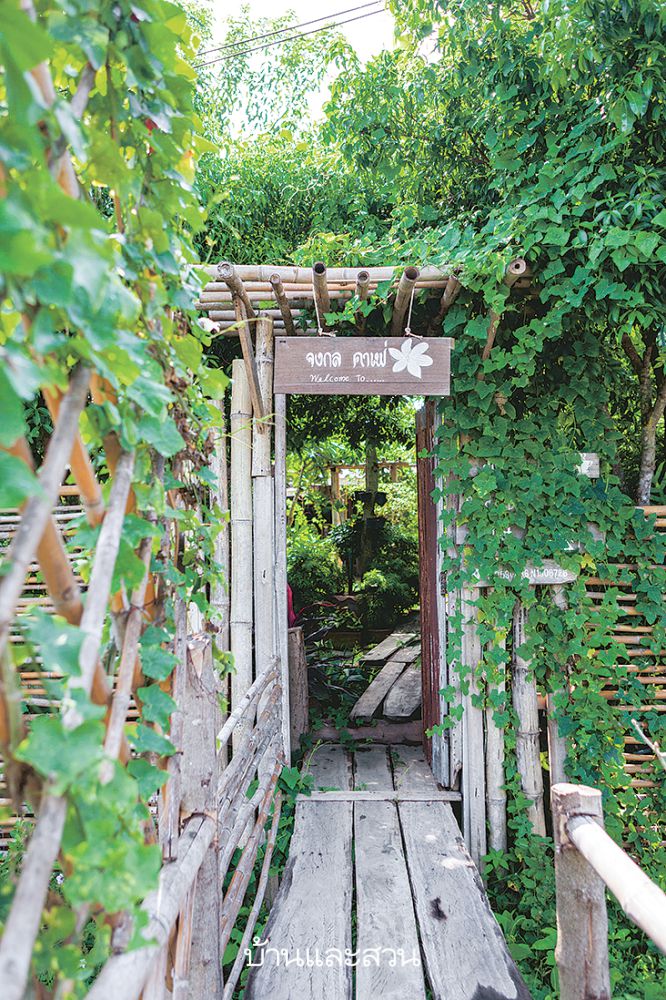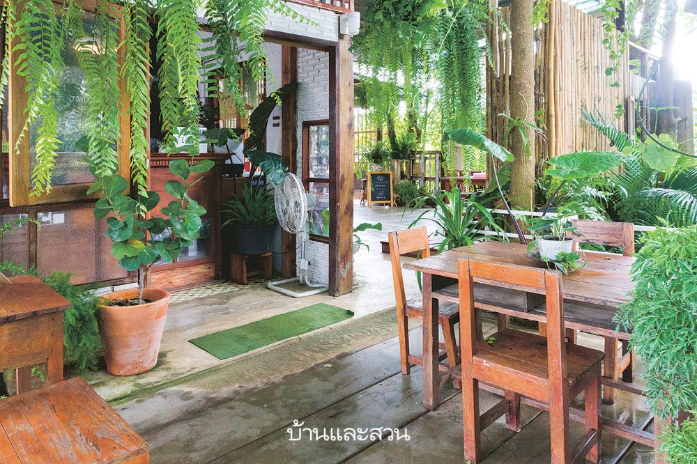 “บริเวณร้านกาแฟมีพื้นที่ประมาณ 400 ตารางเมตร เดิมเป็นสนามหญ้าโล่งๆ มีต้นไม้ใหญ่ที่ปลูกไว้แล้วบ้าง เช่น มะม่วง มะปราง ปีบ กาสะลอง ถือว่าโชคดีครับที่เรามีต้นไม้ใหญ่ๆเยอะ ทำให้บรรยากาศรอบๆ ดูร่มรื่น เราจะสร้างอาคารหลบต้นไม้ พยายามไม่ตัด เพราะต้นไม้มีคุณค่ามาก กว่าจะโตได้ขนาดนี้ใช้เวลานาน จะซื้อต้นใหญ่ๆ ก็แพงมากเช่นกัน พื้นที่สวนรอบๆ เดิมเป็นที่ลุ่มต้องถมดินผสมดินใหม่เพื่อใช้ปลูกต้นไม้จัดสวน ผมเองเรียนเกษตรจากวิทยาลัยเกษตรและเทคโนโลยีสุโขทัย พอจะมีพื้นฐานเรื่องต้นไม้อยู่แล้ว อาศัยความชอบส่วนตัว และมีประสบการณ์ออกแบบจัดสวนมาบ้างครับ”