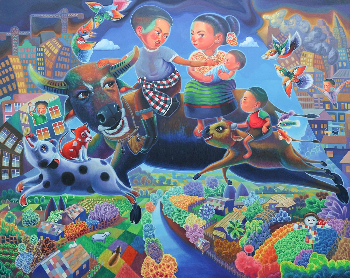 (ภาพบน ศิลปิน : ประเทือง ก่ำพัด | ผลงาน : อิสระแห่งความสุข เทคนิค : สีน้ำมันบนผ้าใบ )
