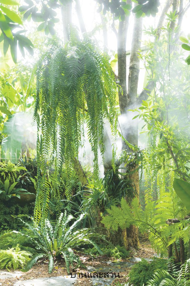 “เนื่องจากผมชอบสวนป่าอยู่แล้ว จึงสะสมเฟินสไบนางไว้ส่วนหนึ่ง แล้วนำมาแขวนตามต้นไม้ใหญ่ เพราะรูปทรงพลิ้วสวยดูเป็นธรรมชาติ หากต้นไหนไม่งามเท่าที่ควร ให้ลองสังเกตดูเรื่องแสงก่อนว่าแดดแรงเกินไปไหม หรือครึ้มไปลองขยับย้ายที่แขวน หากเหมาะสมเขาจะสมบูรณ์มาก” ความพลิ้วไหวในเส้นสายของไม้แขวนเหล่านี้ นอกจากทำให้บรรยากาศของสวนป่าธรรมชาติเด่นชัดขึ้นแล้ว ยังช่วยพรางตาปิดมุมมองที่ไม่น่าดู และบังสิ่งก่อสร้างได้ดีอีกด้วยแม้สวนจะมีพรรณไม้หลากหลาย แต่หากพูดถึงการดูแลแล้ว เจ้าของบ้านผู้อยู่กับสวนอย่างเข้าใจบอกเราว่า ดูแลไม่ยากแลย