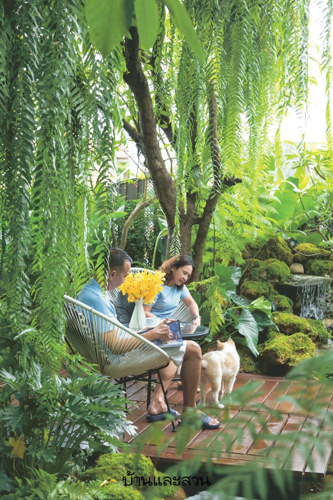 “สวนนี้ดูแลง่ายมาก เพราะเราปล่อยให้ต้นไม้เติบโตอย่างอิสระ หลัก ๆ โดยทั่วไปก็มีแค่เก็บใบไม้ที่ร่วง ส่วนการรดน้ำใช้ระบบสปริงเกลอร์ตั้งเวลาอัตโนมัติ เปิดรดวันละ 4 ครั้ง ครั้งละ 10 นาที เพื่อเพิ่มความชุ่มชื้นให้พรรณไม้จำพวกเฟิน ช่วงฤดูฝนจะปรับลดความถี่ลงให้เหมาะสมส่วนเรื่องตัดแต่งนั้น หลัก ๆ เพียงตัดกิ่งที่ยื่นเกินออก เพื่อเปิดช่องแสง โดยตัดปีละครั้งเท่านั้น” คุณชนะศักดิ์เจ้าของบ้านผู้อยู่กับสวนกล่าวสำหรับผู้ที่ชื่นชอบสวนแนวนี้