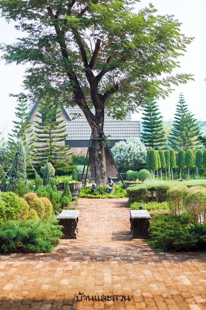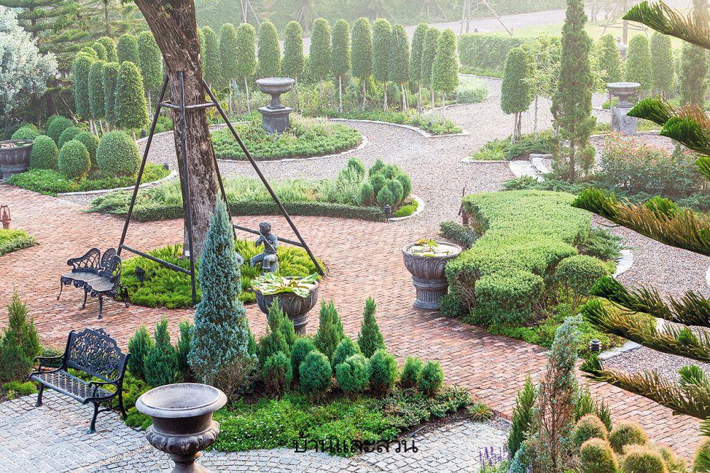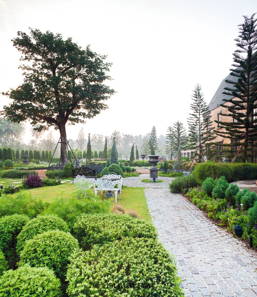 “วางตำแหน่งที่นั่งด้วยลานคอบเบิลสโตนกับม้านั่งและชุดโต๊ะสนามกระจายไปตามจุดต่างๆ ในสวน สร้างความน่าสนใจตลอดทางด้วยไม้ตัดแต่งฟอร์มผสมกับไม้พุ่มที่มีผิวสัมผัสหลากหลาย เสริมด้วยทางเดินแผ่นหินฟรีฟอร์มที่ปลูกหญ้าแทรกตรงช่องว่างเพื่อลดทอนความแข็งกระด้างของวัสดุและยังช่วยเพิ่มพื้นที่สีเขียวแบบไม่ต้องดูแลมากนัก เมื่อได้ฟังก์ชันต่างๆ ครบแล้ว เราก็สร้างบรรยากาศของสวนยุโรปด้วยการเลือกใช้ไม้ใหญ่ฟอร์มสวย ซึ่งพระเอกของเราคือสนฉัตร ซิลเวอร์โอ๊ก ส่วนไม้พุ่มเป็นพวกสนบลู สนออสเตรเลีย สนหอม โรสแมรี่สนมังกร นีออน สนเล้อื ย สนทรายทอง หลิวหอมแปรงล้างขวดแคระ ซิลเวอร์บอสตัน บางตำแหน่งของแปลงปลูกพรรณไม้ฟรีฟอร์มผสมกับไม้ล้มลุกแซมด้วยไม้ดอกที่มีสีสันปะปนบ้างเพื่อให้สวนดูน่าสนใจและสดใสตลอดเวลา”