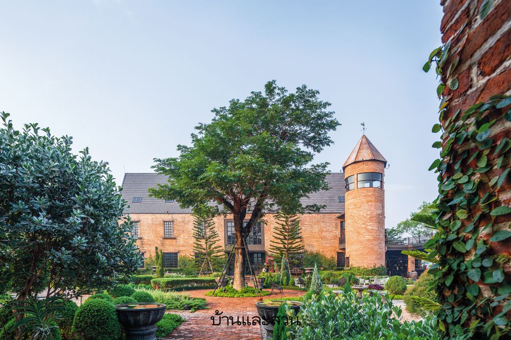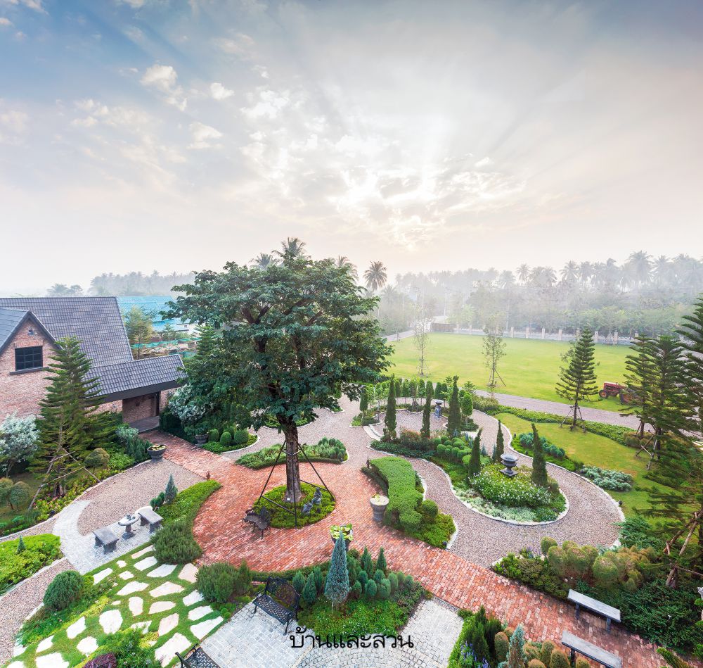 จุดเริ่มต้นจากการหลงใหลการสะสมของเก่าของ นายแพทย์สุวิน ไกรภูเบศ ประธานเจ้าหน้าที่บริหาร บริษัทบิวตี้ คอมมูนิตี้ จำกัด(มหาชน) ต่อยอดมาสู่การออกแบบบ้านและสวนสวยในคอนเซ็ปต์อินดัสเทรียลลอฟต์ ผสานความงามที่มีกลิ่นอายคลาสสิกไว้ได้อย่างลงตัว ลบภาพเก่าบนเนื้อที่ราว 3 ไร่ครึ่งที่เคยเป็นสวนมะพร้าวออกไปอย่างสิ้นเชิง บ้านพักตากอากาศหลังงามริมแม่น้ำแม่กลองกับสวนสวยท่ามกลางสายหมอกจางๆ ยามเช้าเป็นภาพมุมสูงที่เรามองเห็นจากบนหอคอยที่อยู่ติดกับตัวบ้าน ซึ่งเผยให้เห็นแผนผังการจัดวางอย่างเหมาะสมและลงตัวตามแบบฉบับสวนยุโรป โดยได้ คุณโต้ง – ศุภกิจ มีลาภ จากสุขเย็นการ์เด้นท์เป็นผู้ออกแบบและจัดสวนทั้งหมด