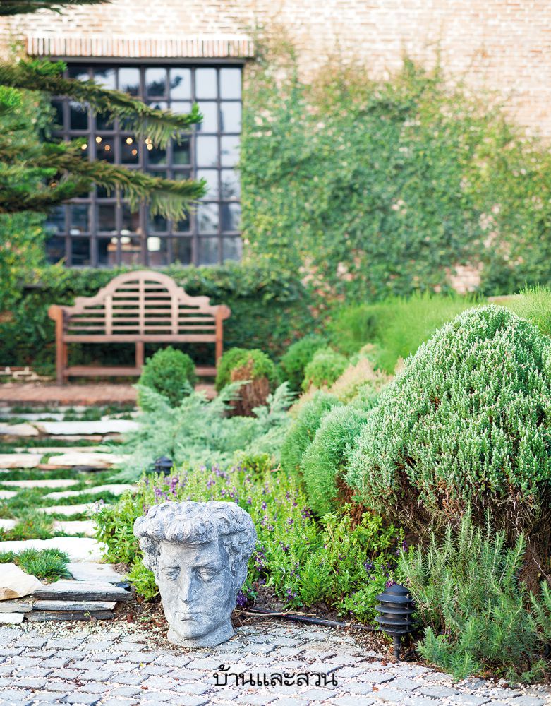 เองที่เป็นคนชอบสะสมของเก่าและการตกแต่งแบบอินดัสเทรียล เมื่อมีองค์ประกอบหลักๆ ของอาคารเป็นแนวทางให้สวนแล้ว เลยให้โจทย์กับคุณโต้งว่าอยากได้อารมณ์สวนสไตล์ยุโรป มีพรรณไม้ตัดแต่งฟอร์มเน้นสีเขียวดูสบายตา ไม่ต้องมีรายละเอียดกระจุกกระจิกมาก ไม่อยากให้ออกมาเป็นแนวสวนอังกฤษ ข้อสำคัญ ขอพรรณไม้ที่ดูแลง่าย เพราะมีเนื้อที่ค่อนข้างเยอะ”