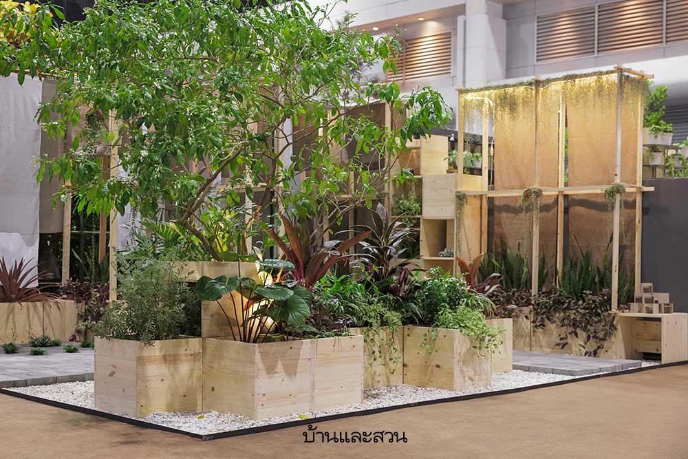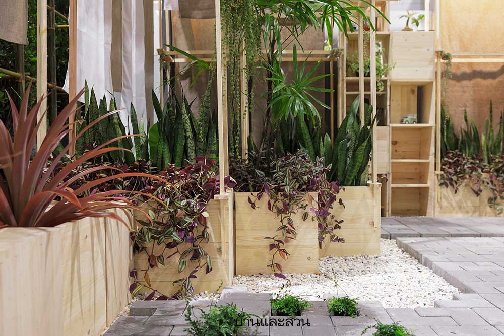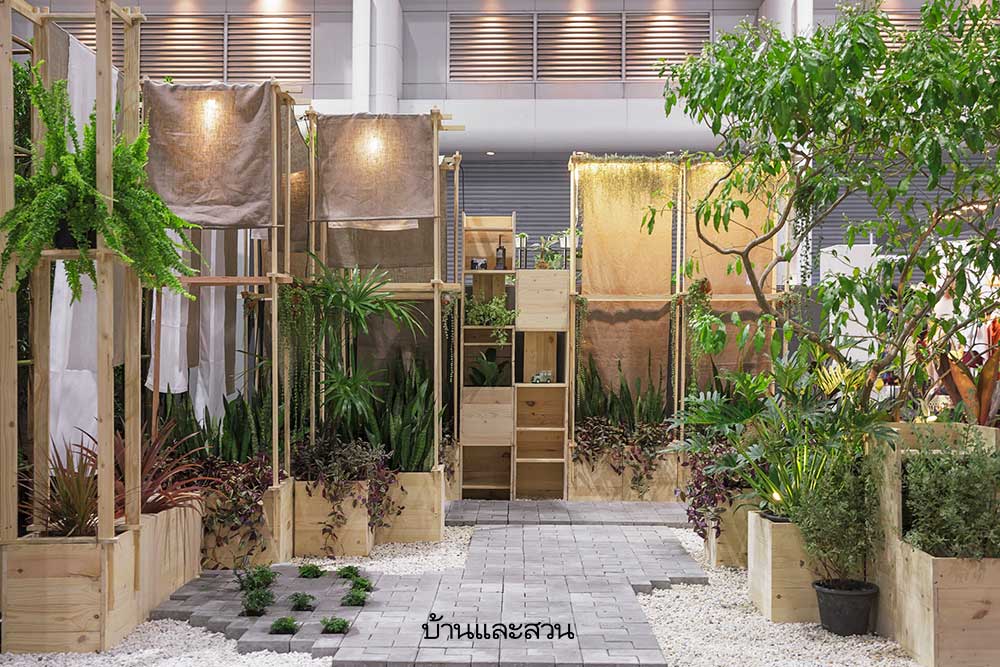 Concept : สวนหลากหลายรูปแบบเพื่อการพักผ่อน เว้นที่ว่างสำหรับทำกิจกรรมต่างๆ ที่สำคัญใช้ตัว Modular ที่จัดวางง่าย ปรับเปลี่ยนได้หลายรูปแบบตามความต้องการ พื้นสวนโรยด้วยกรวดแม่น้ำเพื่อให้ง่ายต่อการดูแลรักษาและปรับเปลี่ยน ส่วนพันธุ์ไม้ เนื่องจากเป็นสวนที่ได้รับแสงแดดในช่วงเช้า จึงเลือกใช้ไม้ในร่ม โดยมีต้นพุดเป็นไม้ประธานที่มีกลิ่นหอมและกิ่งก้านสวยงาม เลือกลิ้นมังกรมาปลูกเพื่อฟอกอากาศให้กับสวน