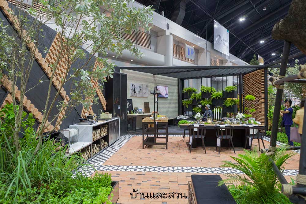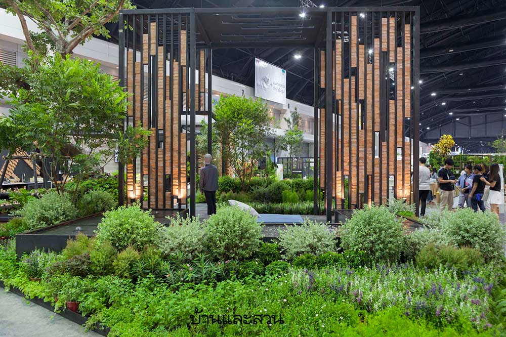 มาถึงโซน Garden Show แล้วกิจกรรมที่ต้องทำคือการถ่ายรูปค่ะ เพราะความโดดเด่นของผนังอิฐมอญแต่ละแบบนั้นชวนให้บันทึกภาพเก็บไว้จริงๆ แน่นอนว่า “อิฐมอญ” เป็นวัสดุที่ Mass เพราะทุกคนรู้จักกันดี แต่คุณปณัฐ สุมาลย์โรจน์ จากเพอโกล่าร์ นักออกแบบสวนผู้รับหน้าที่จัดสวนโชว์ปีนี้บอกว่า “อิฐต้องมีความพิเศษมากกว่านั้น” จึงนำวัสดุที่คุ้นตาเหล่านี้มาสร้างแพตเทิร์นใหม่ 5 แบบ ที่สร้างความสวยงามให้มุมสังสรรค์ในสวน โดยเลือกใช้พรรณไม้ที่ดูแลง่าย เน้นการจัดวางแบบเรียบๆ มีเพียงไม้ประธานต้นใหญ่ที่โดดเด่นคู่กับโครงสร้างเหล็ก ว่าแล้วก็เดินเข้าไปถ่ายรูปกันเถอะ!