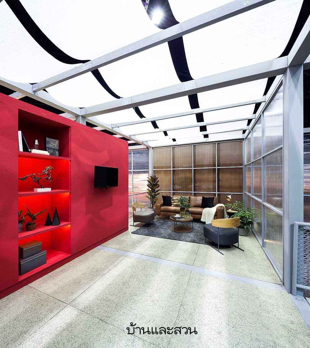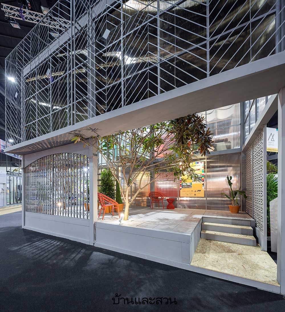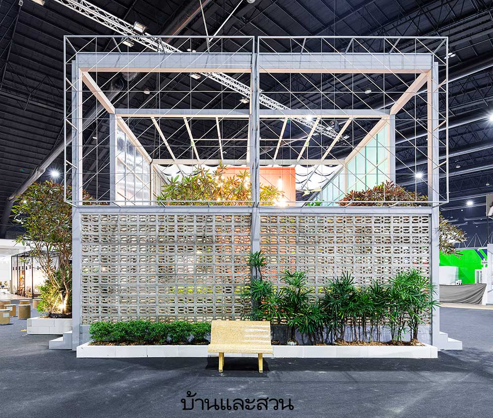 แต่สิ่งพิเศษที่แตกต่างของบ้านตัวอย่างสีเทากลางงานบ้านและสวนแฟร์นี้คือการนำวัสดุแมสๆมาสร้างลูกเล่นให้งานดีไซน์ในแต่ละส่วน อย่างเช่นผนังบล็อกช่องลมที่เรียงต่อสลับลาย บางส่วนกั้นด้วยแผ่นพอลิคาบอร์เน็ตที่ราคาสบายกระเป๋าแต่ยังดูสวยเก๋ได้ รวมถึงประตูเหล็กยืดที่ดีไซน์มาให้ได้ว้าวกัน หากมาถึงจุดนี้อย่าลืมเดินเข้าไปดูการตกแต่งภายในที่แบ่งฟังก์ชันแต่ละห้องแบบโมดูลาร์ ซึ่งหากเป็นบ้านในชีวิตจริงคงทำให้การใช้ชีวิตในบ้านสนุกสนานขึ้นน่าดู ออกแบบโดย ณรงค์ โอถาวร จาก SO Architect