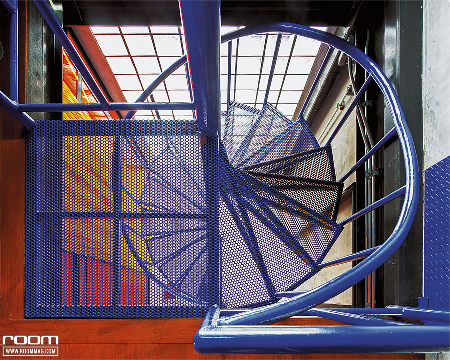 โถงบันไดแบบกึ่งเอ๊าต์ดอร์ ตัวบันไดเป็นโครงสร้างเหล็กรียูส โดยใช้รั้วเฟรมเหล็กเป็นขอบเขตด้านข้าง แทนราวจับ ถัดขึ้นมากรุเมทัลชีททำเป็นผนังต่อเนื่องจากด้านนอกมาถึงด้านใน