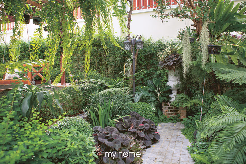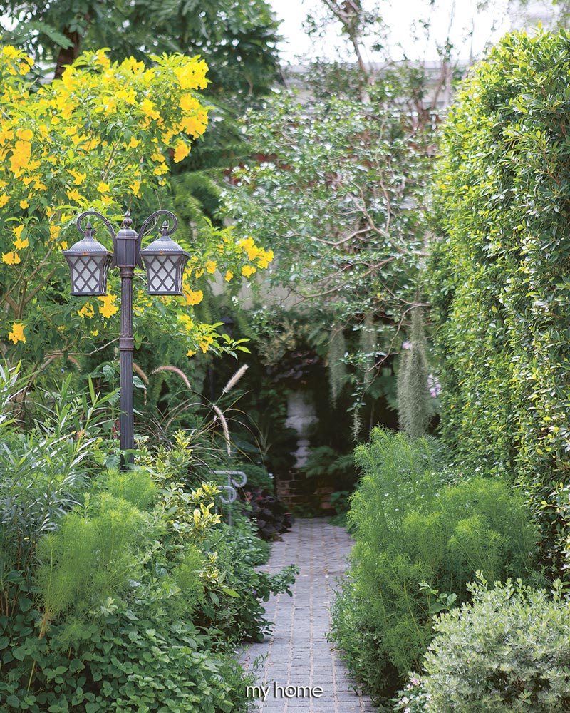 “ ตอนเข้ามาสำรวจพื้นที่ครั้งแรกจะเห็นได้ว่าขนาดของพื้นที่ค่อนข้างจำกัดโจทย์แรกสำหรับผมจึงเป็นการออกแบบ เพื่อสร้างพื้นที่สีเขียวให้ได้มากที่สุด ผมจึงพยายามแทรกพรรณไม้ต่าง ๆ ลงไปตามแนวทางเดินเน้นเป็นไม้ดอกและพรรณไม้ในร่ม นอกจากนี้พื้นที่สวนตรงนี้ผมยังออกแบบให้เป็นลักษณะของขั้นบันได เพื่อเชื่อมต่อและเปลี่ยนระดับความสูงจากบริเวณลานหน้าบ้านขึ้นไปสู่ตัวอาคาร ทำให้สามารถเดินออกมาจากประตูข้างบ้านถึงสวนได้พอดี รวมถึงเป็นการสร้างมุมมองให้ทุกหน้าต่างภายในบ้านสามารถมองออกมาชมสวนได้ อีกทั้งตรงสุดปลายทางเดินผมก็จัดสรรพื้นที่ไว้ให้เป็นแปลงผักสวนครัวขนาดเล็กในลักษณะเลียนแบบบ่อน้ำของสวนสไตล์วินเทจไว้สำหรับปลูกผักสวนครัวเล็กน้อย เพื่อใช้ประกอบอาหารกันในครัวเรือนอีกด้วย ” คุณมอ -อัศนัย แก่นจันทร์ จากร่มรื่นแลนด์สเคป กล่าวไว้พร้อมมาเราออกเดินไปตามทาง