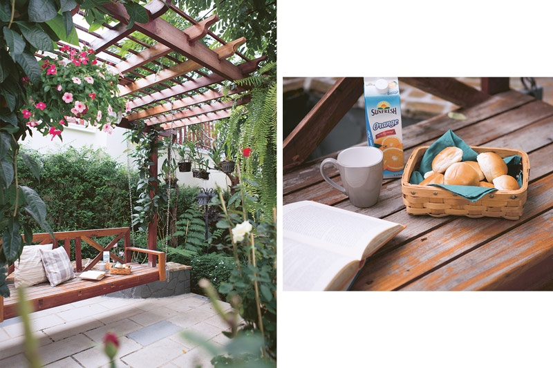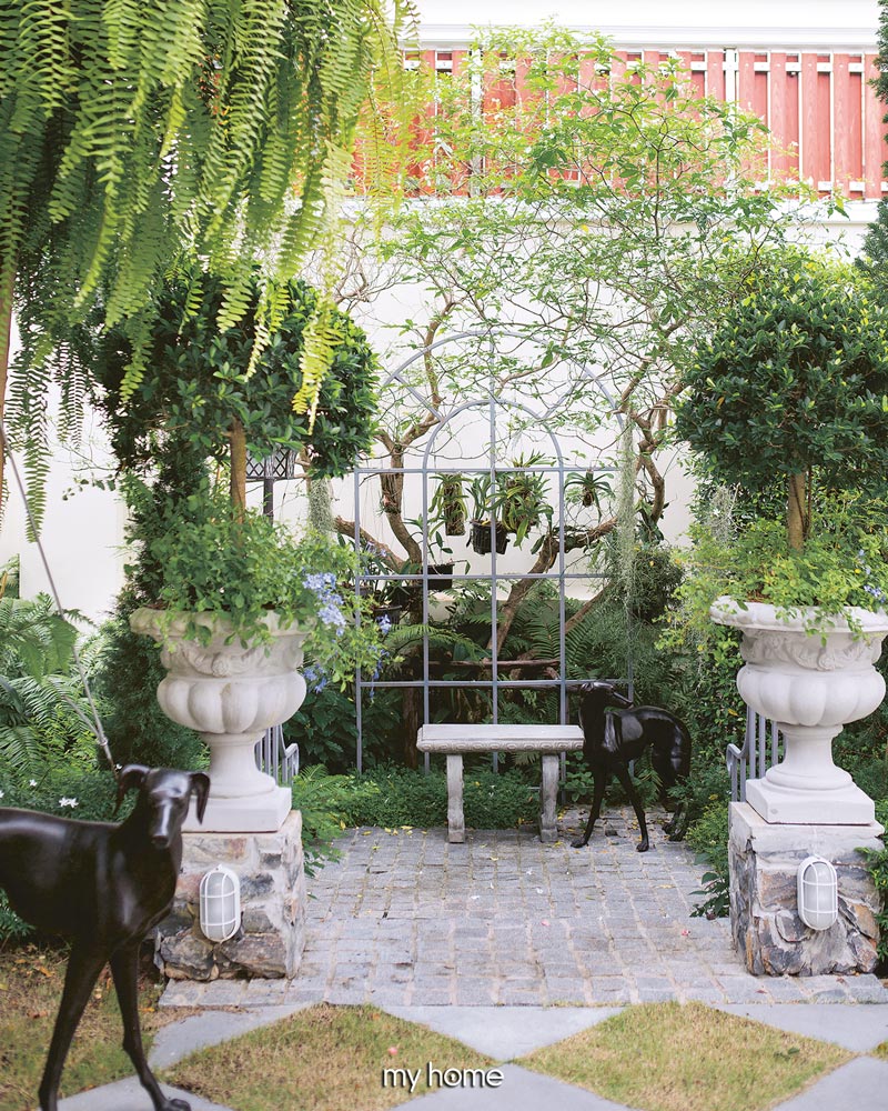 “ ในวันที่ว่างหรืออากาศดี ๆ ก็จะออกมานั่งเล่นตรงนี้บ่อย ๆ เพราะเขาจัดไว้ค่อนข้างร่มรื่นทำให้สามารถออกมานั่งเล่นได้ สบายสามารถชมนกชมไม้หรือมองกลับไปก็จะเห็นพื้นที่บ้านเกือบทั้งหมด และถ้าวันไหนอากาศร้อนก็ยังสามารถมองเห็นพื้นที่สวนจากภายในบ้านได้ ทำให้พื้นที่สวนเป็นเหมือนพื้นที่สีเขียวที่เป็นทั้งจุดพักกายและสายตาค่ะ ” เจ้าของบ้านช่วยเสริมข้อมูล ถึงแม้ว่าพื้นที่โอเอซิสในทะเลทรายจะเล็กแค่ไหนหรือพื้นที่สีเขียวภายในบ้านจะมีขนาดเท่าไรก็ตามก็ยังสามารถสร้างความสุขและเติมเต็มทุกชีวิตได้เช่นเดียวกัน