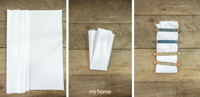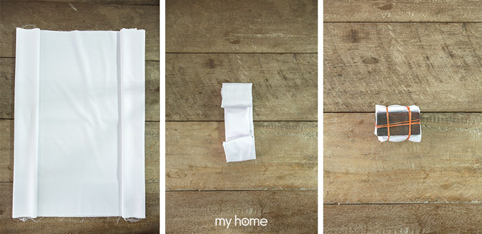 - นำผ้าใยธรรมชาติมาพับให้มีความกว้างประมาณ 1 นิ้ว พับเข้ามาสู่กึ่งกลางทั้งจากทางซ้ายและทางขวา