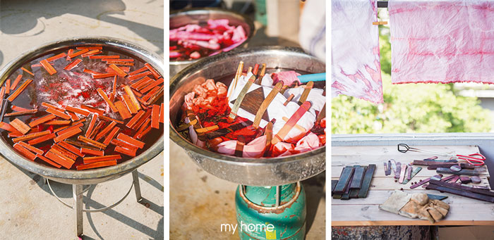 - เมื่อครบเวลาที่กำหนดไว้แล้วนำมัดผ้าที่มัดเตรียมไว้ลงไปต้มในหม้อทั้งสองใบ โดยหม้อที่ต้มไม้ฝางและใส่สารส้มเพิ่มเติมลงใบ จะให้สีชมพูโอลด์โรส ส่วนอีกใบที่ไม่ใส่สารส้มจะได้สีชมพูม่วง ต้มผ้าต่อไปอีกประมาณ 30 นาที – 1 ชั่วโมง