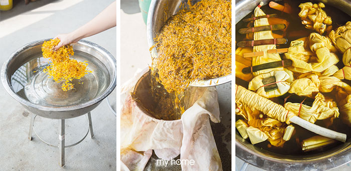 - นำหม้อน้ำที่กรองดอกดาวเรืองออกแล้วตั้งไฟอ่อน ๆ ให้น้ำยังมีความอุ่นอยู่เสมอจากนั้นเติมสารส้มลงไปในหม้อจำนวนเล็กน้อย เมื่อเป็นตัวช่วยให้ผ้าของเราติดสีได้ดีขึ้น นำมัดผ้าที่เรามัดเตรียมไว้ลงไปต้มในหม้อทิ้งไว้ประมาณ 30 นาที – 1 ชั่วโมง