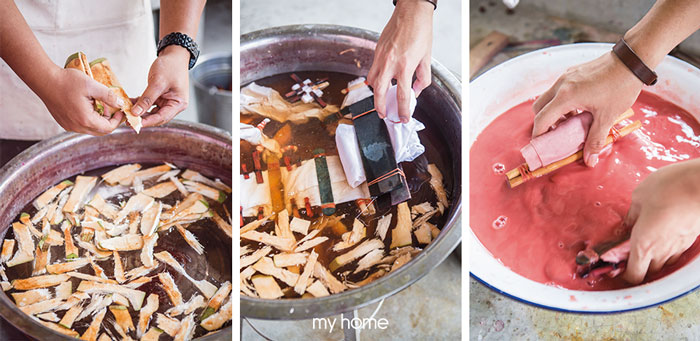- ใส่ผ้าที่มัดเตรียมไว้ลงไปในหม้อ ต่อไปอีกประมาณ 30 นาที – 1 ชั่วโมง