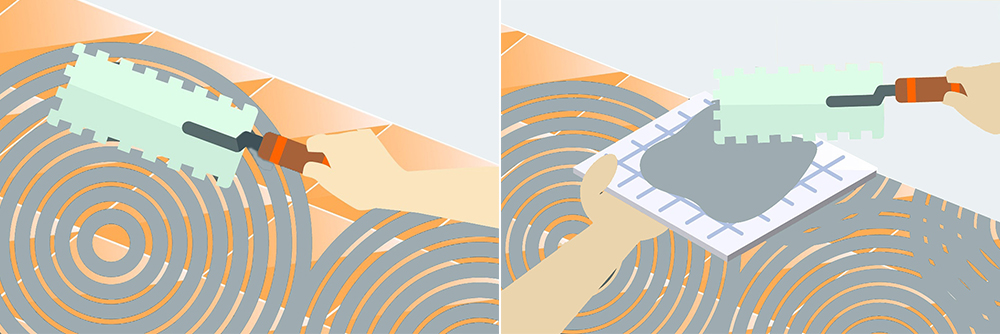 3. จากนั้นใช้เกรียงตักปูนกาวลงไปบนพื้นกระเบื้องเดิมเกลี่ยปูนให้เรียบแล้วใช้เกรียงหวีปาดร่อง ทำได้ทั้งแบบร่องวงกลมหรือร่องเส้นตรง จากนั้นปาดกาวซีเมนต์ที่แผ่นกระเบื้องเพื่อเพิ่มการยึดติด
