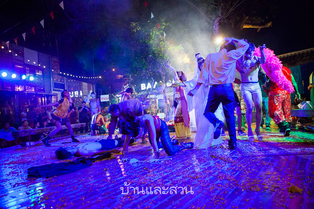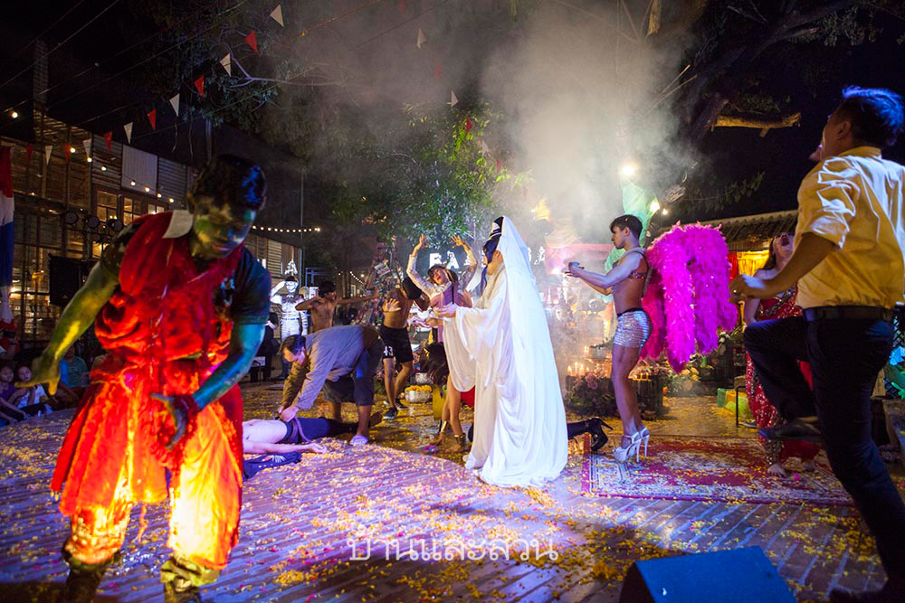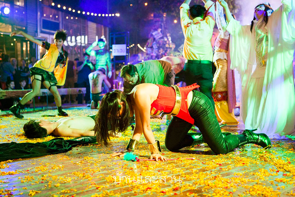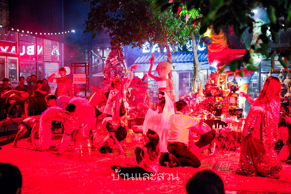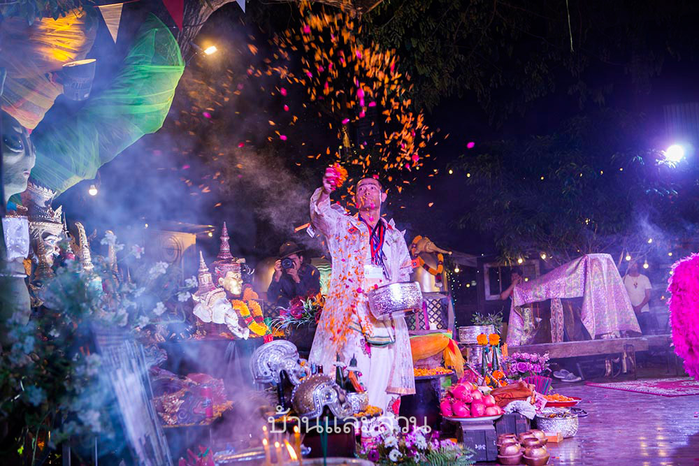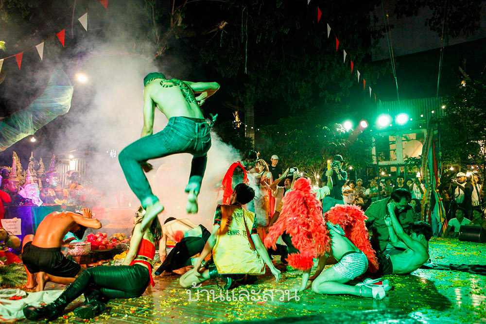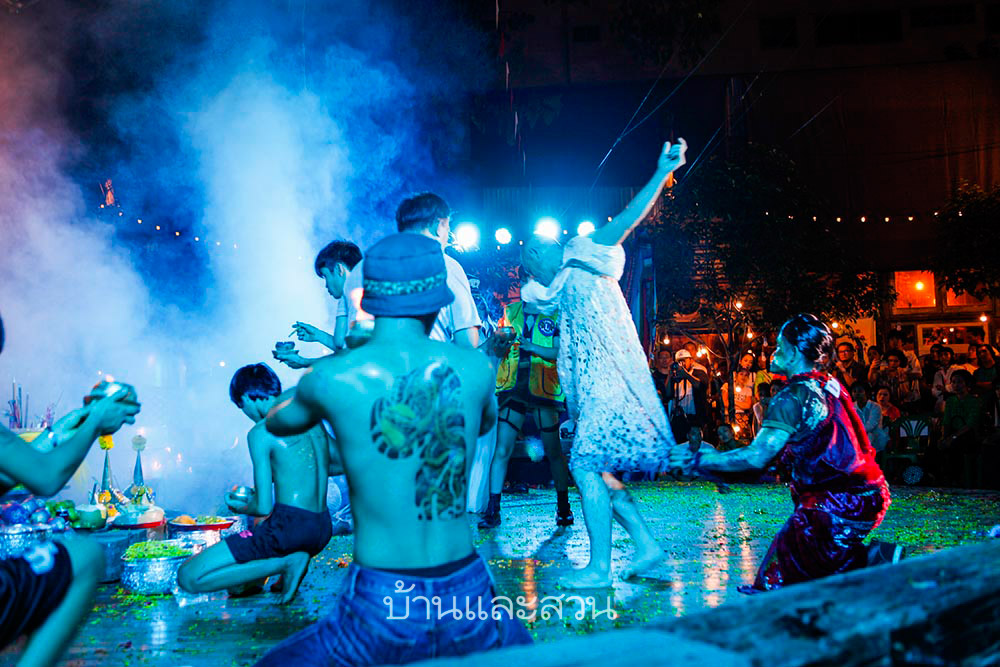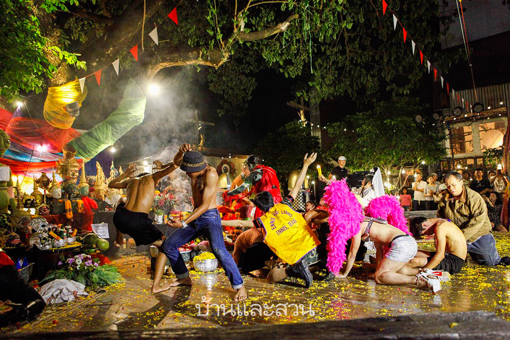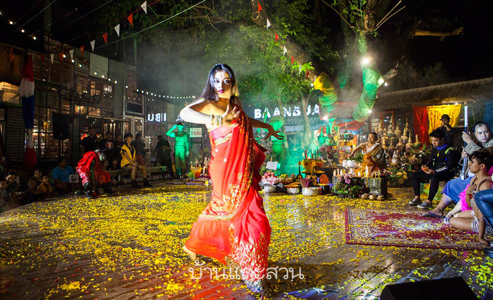 เมื่อวง ปี่พาทย์ ทำรัว … องค์เทพเริ่มประทับ ตัวละครมากมายขึ้นมาให้ความบันเทิงพร้อมกับโชว์ศิลปะการเต้นร่วมสมัยที่ผสมกับการเต้นที่หลากหลายไม่ว่าจะเป็นการเต้นแบบแขก แบบจีน และ ท่านาฏศิลป์ไทยที่เรามักจะเห็นได้จากการแสดงโขนแบบอนุรักษ์นิยม