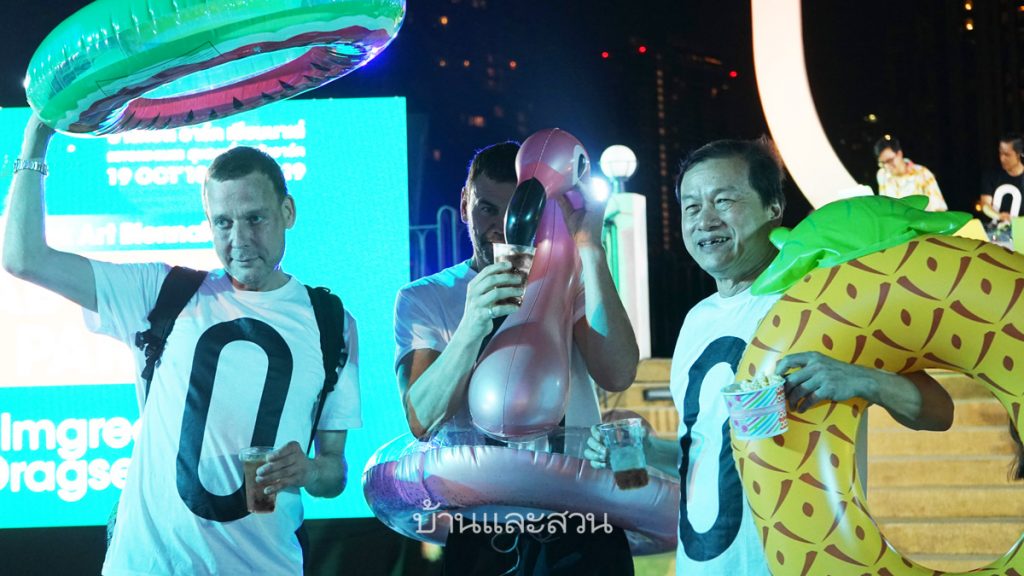 หลังจากพูดคุยถึงผลงานไปต่างๆไปแล้ว ถึงเวลาของปาร์ตี้ริมสระน้ำ ที่ได้ทีม Dude Sweet มาช่วยสร้างความบันเทิงจุดไฟใส่สีสันในยามค่าคืน ซึ่งทั้ง Elmgreen & Dragset ได้มาร่วมสนุก และ พูดคุยศิลปินท่านอื่นๆ รวมถึง ผู้ที่มารวมงานอย่างเป็นกันเอง ซึ่งทาง baanlaesuan.com ก็ได้มีโอกาสพูดคุยกับสองศิลปินระดับโลกนี้ ในบรรยากาศสบายๆ หลายประเด็น