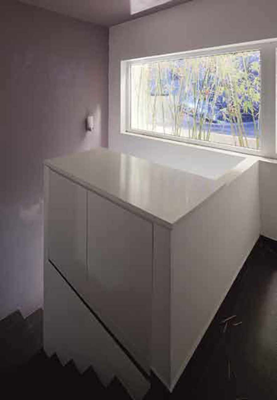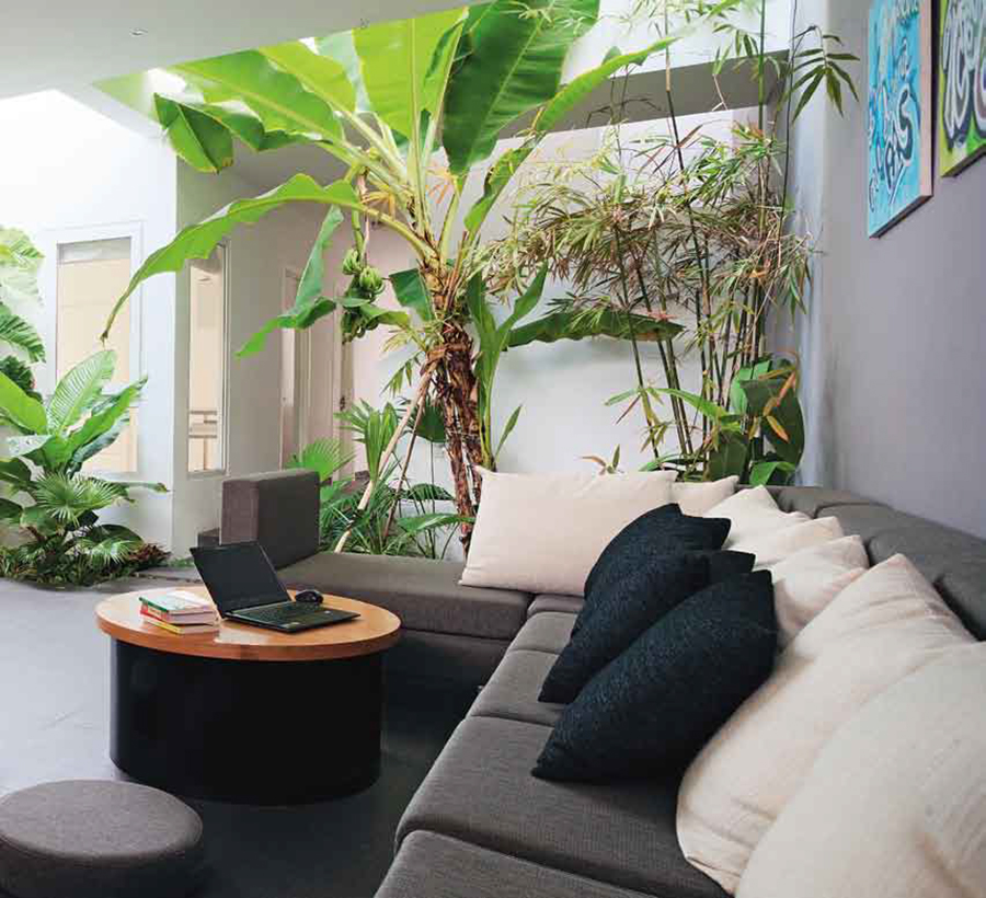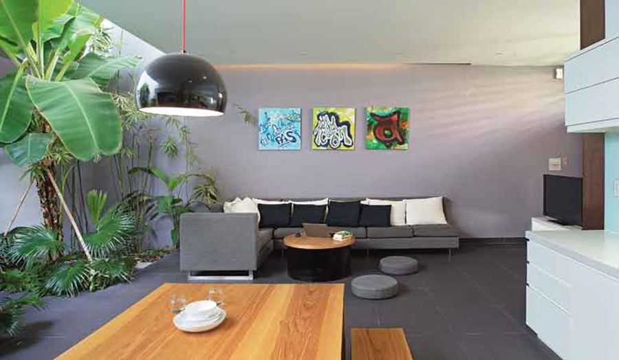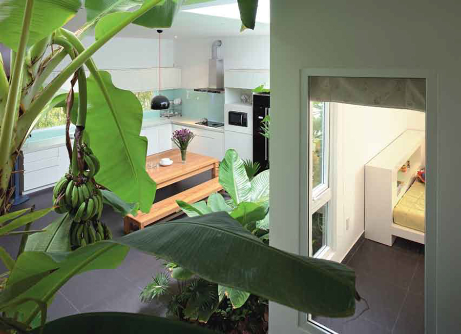 มองโดยภาพรวมแล้วพื้นที่ของบ้านนี้แบ่งเป็นสองส่วน คือ พื้นที่ใช้งานและพื้นที่พักผ่อน โดยมี “สวนเมืองร้อน” เชื่อมทั้งสองส่วนนี้เข้าด้วยกัน โดยออกแบบให้มีช่องแสงด้านบนปล่อยให้แสงธรรมชาติบางส่วนส่องเข้าสู่ภายในบ้านเพื่อให้ต้นไม้ได้เติบโต นอกจากนี้ยังสร้างความรู้สึกสบายๆเหมือนนั่งอยู่กลางสวน ไอเดียนี้ยังไม่จำเป็นต้องพึ่งแสงจากหลอดไฟและเครื่องปรับอากาศในช่วงกลางวัน ช่วยให้เจ้าของบ้านประหยัดค่าใช้จ่ายได้อีกทาง