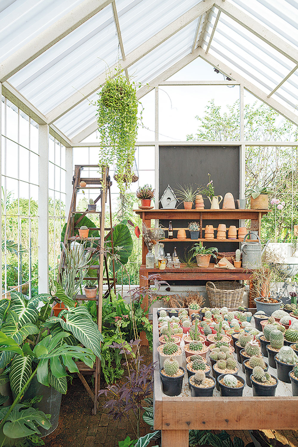 ออกแบบเรือนกระจกให้อยู่ใต้ร่มเงาต้นไม้ โดยยกระดับพื้นประมาณ 10 เซนติเมตรและโรยกรวดป้องกันน้ำนอง ฐานผนังก่อด้วยหิน และทำประตูหน้าต่างโดยรอบเพื่อให้สามารถควบคุมการระบายอากาศได้ ก็ใช้ปลูกต้นไม้ที่ต้องดูแลเป็นพิเศษ หรือมานั่งทำงานอดิเรกท่ามกลางธรรมชาติได้อย่างสบายอารมณ์