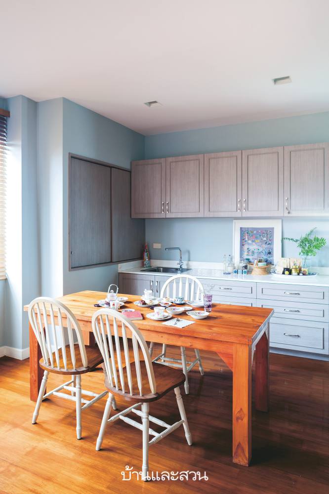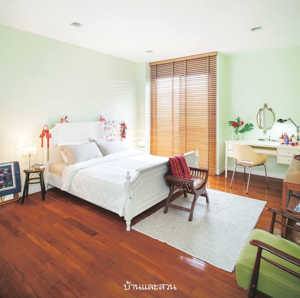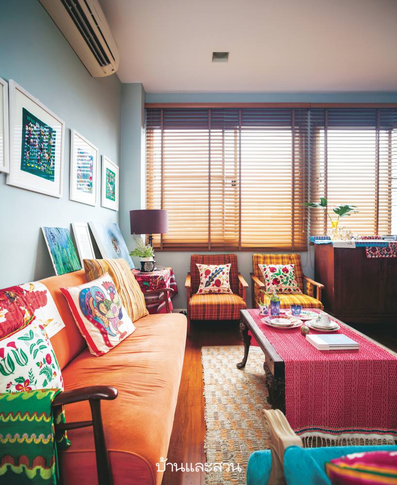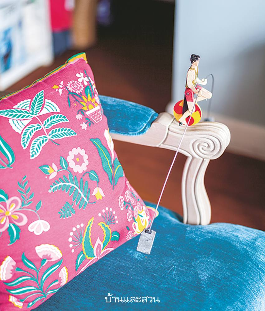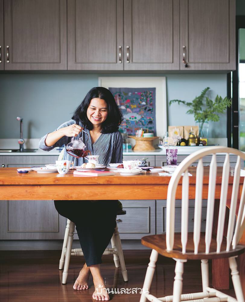“ส่วนตัวเป็นคนชอบของที่ทำด้วยมือ ชอบผ้าปัก ชอบลายดอก ซึ่งมักแฝงด้วยคาแร็กเตอร์ของท้องถิ่นนั้นๆ มีความงามเฉพาะตัว อย่างผ้าปักของชาวเขาโครงการหลวง หมอนปักจากอินเดีย และงานฝีมือจากโครเอเชีย มาเลเซีย พม่า ของตกแต่งหลายชิ้นเป็นของเก่าที่บันทึกความทรงจำระหว่างอยู่บ้านเดิม เช่น โซฟาที่เคยนั่งมาตั้งแต่เด็กก็นำมาซ่อมและเปลี่ยนผ้าบุใหม่ โต๊ะที่นั่งทำการบ้านก็เปลี่ยนฟังก์ชันเป็นโต๊ะข้างโซฟาคลุมด้วยผ้าพื้นเมือง รวมถึงของแอนทีคที่ซื้อมาอย่างอาร์มแชร์สไตล์คลาสสิก โต๊ะกลางทรงยุโรป แต่ประดับด้วยผ้าและหมอนปักสไตล์ชนเผ่าอยู่ทุกมุมในบ้าน ส่วนถ้วยและจานลายสวยเป็นของสะสม โดยเริ่มจากเห็นแม่มีจานลายดอกสวยๆ ซึ่งนำมาจากบอสตันสมัยที่เขาไปเรียน จึงเป็นแรงบันดาลใจให้อยากสะสมจานจากยุโรปบ้าง และมักได้ออกมาอวดโฉมเวลาชวนเพื่อนๆ มาสังสรรค์จิบชากินขนมกัน”