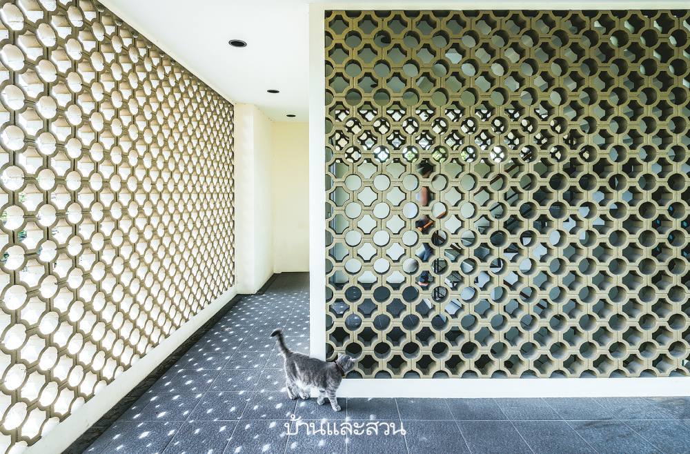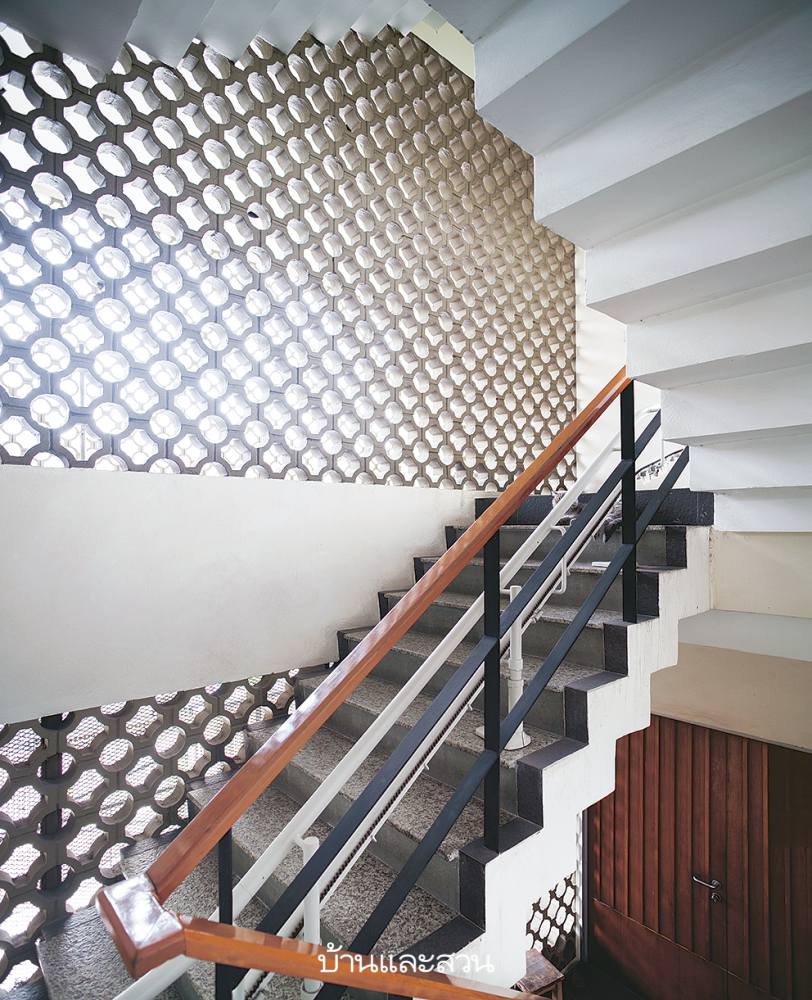 ระหว่างการเดินขึ้นโถงบันไดที่ล้อมรอบด้วยผนังอิฐช่องลมซ้อนกันเป็นเลเยอร์ เป็นวิธีการกรองแสงและเปิดรับสภาพแวดล้อมรอบตัวที่ให้ความรู้สึกไม่ตัดขาดกับธรรมชาติ และเหมือนเดินอยู่ใกล้พื้นดินแม้จะอยู่ชั้นบนก็ตาม