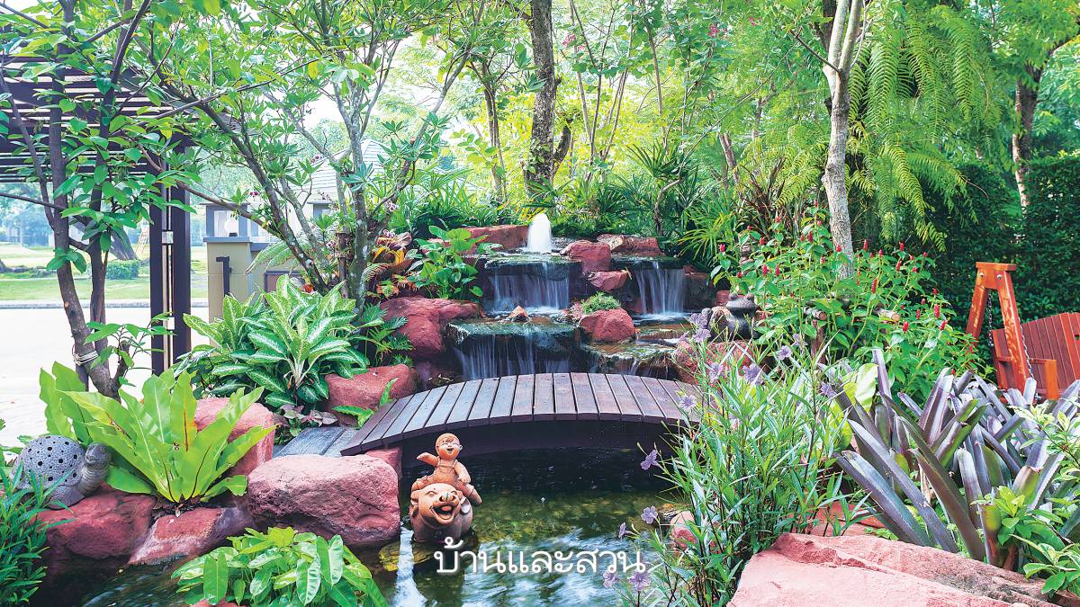 “สวนนี้ใช้เวลาทำประมาณ 6 เดือน โชคดีที่เจ้าของบ้านน่ารักมาก ไม่ได้กำหนดกะเกณฑ์อะไรมาก ผมเองก็ถนัดสวนแนวนี้อยู่แล้ว เลยทำงานได้ไม่ยาก เราออกแบบให้มีบ่อปลา น้ำตก น้ำพุ ลำธารอยู่ตรงกลางระหว่างบ้านสองหลัง เพื่อให้เป็นเหมือนพื้นที่ส่วนกลางที่ทั้งครอบครัวจะได้ใช้ประโยชน์ร่วมกัน มีศาลาไม้กลางน้ำไว้นั่งพักผ่อน มีระเบียงไม้เป็นทางเชื่อมและมีทางเดินเชื่อมต่อกันทั้งสวน เพื่อให้คุณแม่ได้นั่งรถเข็นชมรอบๆ สวนได้ เลือกปลูกไม้ในร่มเป็นหลัก เนื่องจากมีต้นไม้ใหญ่เยอะ พื้นที่สวนโดยรวมค่อนข้างร่ม แซมด้วยไม้ดอก และไม้ดอกหอมไทยๆ เช่น ไคร้ย้อย โมก จำปี แก้วมุกดา ชมนาด แก้วหิมาลัย ให้ออกดอกหมุนเวียนกันตลอดทั้งปี และเลือกใช้ต้นไม้ที่มีสีสันสวยงาม เช่น โกสน พรมญี่ปุ่น เบญจรงค์ห้าสี กล้วยไม้ มาแซมตามจุดต่างๆ ในสวนเพื่อเพิ่มความสดใส