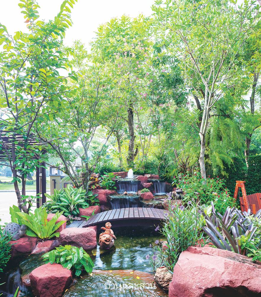 “สวนนี้ใช้เวลาทำประมาณ 6 เดือน โชคดีที่เจ้าของบ้านน่ารักมาก ไม่ได้กำหนดกะเกณฑ์อะไรมาก ผมเองก็ถนัดสวนแนวนี้อยู่แล้ว เลยทำงานได้ไม่ยาก เราออกแบบให้มีบ่อปลา น้ำตก น้ำพุ ลำธารอยู่ตรงกลางระหว่างบ้านสองหลัง เพื่อให้เป็นเหมือนพื้นที่ส่วนกลางที่ทั้งครอบครัวจะได้ใช้ประโยชน์ร่วมกัน มีศาลาไม้กลางน้ำไว้นั่งพักผ่อน มีระเบียงไม้เป็นทางเชื่อมและมีทางเดินเชื่อมต่อกันทั้งสวน เพื่อให้คุณแม่ได้นั่งรถเข็นชมรอบๆ สวนได้ เลือกปลูกไม้ในร่มเป็นหลัก เนื่องจากมีต้นไม้ใหญ่เยอะ พื้นที่สวนโดยรวมค่อนข้างร่ม แซมด้วยไม้ดอก และไม้ดอกหอมไทยๆ เช่น ไคร้ย้อย โมก จำปี แก้วมุกดา ชมนาด แก้วหิมาลัย ให้ออกดอกหมุนเวียนกันตลอดทั้งปี และเลือกใช้ต้นไม้ที่มีสีสันสวยงาม เช่น โกสน พรมญี่ปุ่น เบญจรงค์ห้าสี กล้วยไม้ มาแซมตามจุดต่างๆ ในสวนเพื่อเพิ่มความสดใส