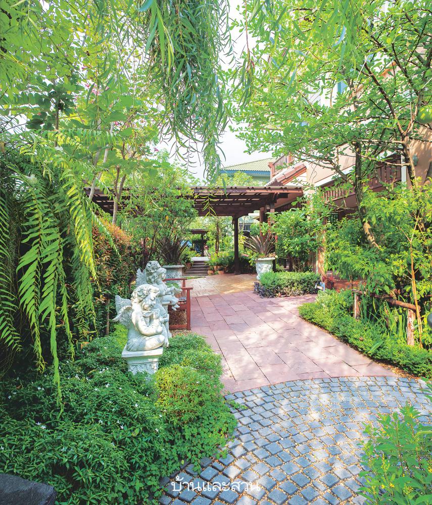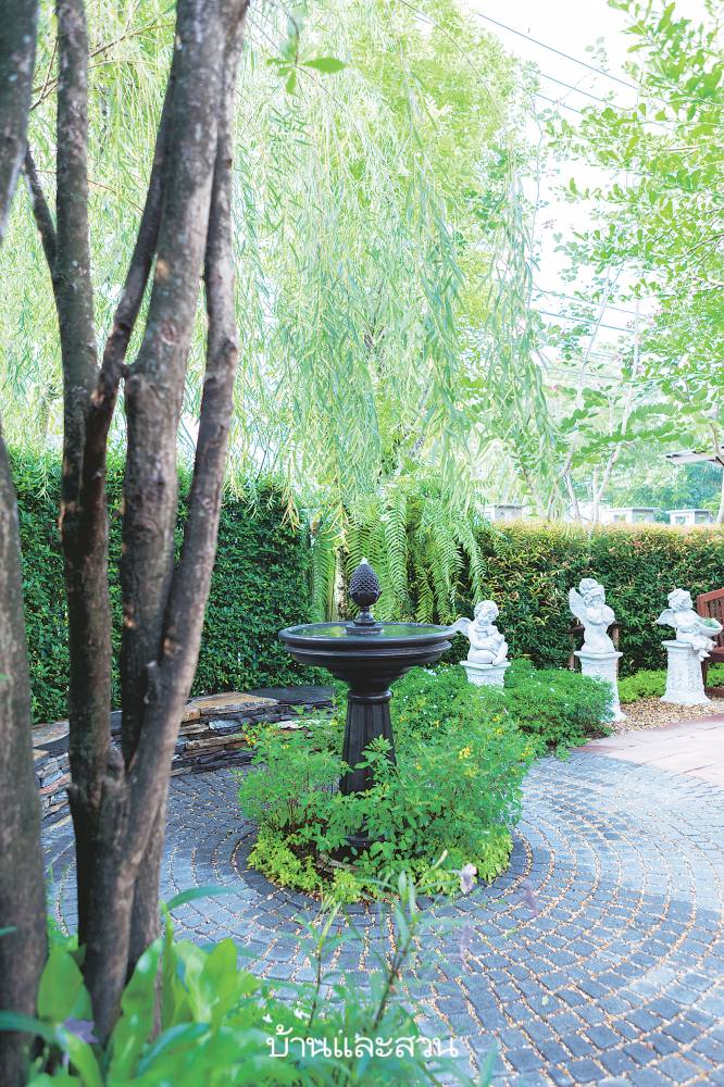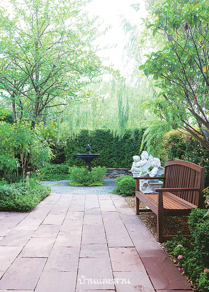 “ส่วนบ้านของคุณเอกสุดาอยากได้สวนที่ดูน่ารักๆ ดูแลง่าย ผมเลือกออกแบบเป็นสวนอังกฤษที่วางแพตเทิร์นง่ายๆ ปูพื้นด้วยแผ่นหิน เลือกใช้พรรณไม้ที่ดูพลิ้วไหว เช่น หลิว เฟินสไบนาง แซมด้วยไม้ดอกโทนสีหวานๆ ปลูกไทรเกาหลีและคริสตินาตัดแต่งเป็นแนวกำแพงสูงใช้เป็นฉากหลังที่ช่วยให้สวนดูเด่นยิ่งขึ้น และยังช่วยบังสายตาจากบ้านข้างๆ ด้านในสุดของสวนเป็นลานหิน ปูพื้นด้วยคาร์เป็ตสโตน แล้วเรียงแผ่นหินซ้อนกันเป็นที่นั่งยาวโค้ง วางอ่างน้ำพุเล็กๆ ตกแต่งด้วยม้านั่งยาว กระถางเอิร์น และรูปปูนปั้นเทวดาน้อยสไตล์ยุโรป”