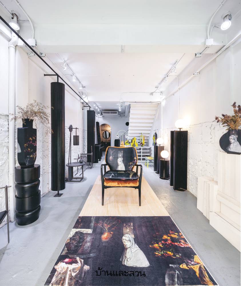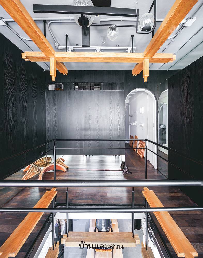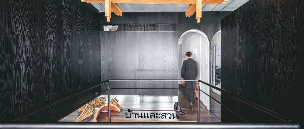 “เหมือนเป็นคอลเล็กชั่นส่วนตัวให้ทุกคนในทีมได้ทดลองทำงานต่างๆ ทั้งงานเหล็ก งานไม้ งานผ้าและเป็นที่โชว์ศักยภาพให้ผู้มาเยือนได้รู้จักเราด้วย พอขึ้นมาชั้น 2 ก็เป็นพื้นที่ทำงานของเรา ผมเลือกทาผนังห้องเป็นสีขาว กั้นห้องด้วยกรอบหน้าต่างโค้งที่ล้อมาจากหน้าต่างโค้งเดิมด้านหน้าอาคาร เหมือนมองงานสถาปัตยกรรมผ่านเฟรมภาพของงานจิตรกรรม ข้างๆ ห้องทำงานเราเรียกว่า ‘ห้องดำ’ ผมได้แรงบันดาลใจจากตอนไปเที่ยวต่างประเทศและได้เข้าไปนั่งในโบสถ์ รู้สึกชอบแสงเงาสลัวๆ ที่ดูสงบนิ่ง เลยเอาสีดำและการจัดแสงแบบนั้นมาใช้กับห้องนี้ แล้วเจาะพื้นตรงกลางทำเป็นที่นั่งแบบห้อยขาที่มองลงไปเห็นความเคลื่อนไหวชั้นล่างได้ โครงสร้างของที่นั่งกับฝ้าเพดานยังสามารถใช้แขวนงานโปรเจ็คท์เวลานำเสนอลูกค้าด้วย ส่วน Material Board ก็วางตามพื้นเลย ผมชอบเอาสองสิ่งที่ต่างกันมาผสมใหม่อย่างงานเก่ากับงานโมเดิร์น ลูกค้าเคยบอกว่างานผมเหมือนนักร้องเพลงแจ๊สที่มีฮิปฮอปปนอยู่ด้วย” (หัวเราะ)