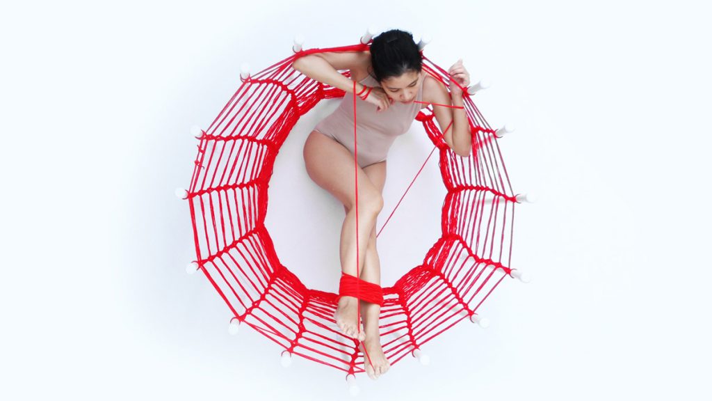 เมื่อผู้ชมซึ่งต่างมาในชุดสีแดงนั่งประจำโต๊ะ เสียงประกอบการแสดงดังขึ้น ศิลปินเริ่มขยับตัว ไปพร้อมๆกับเสียงของการขยับตัวที่ฟังดูหนักแน่น และ เสียงของลมหายใจที่เหนื่อยหอบซึ่งดังสลับขึ้นมาเป็นจังหวะ ศิลปินสาวใช้เท้าเกี่ยวเส้นด้ายที่พันอยู่รอบขาของเธอขึ้นไปพันเสาที่อยู่ปลายเท้า จากนั้นไถลหมุนตัวไปทางเสาต้นถัดไปแล้วทำเช่นเดิม จนครบรอบ แล้วก็ทำซ้ำวนไปเรื่อยๆ…. เพื่อให้เห็นภาพ เชิญชมคลิปบางช่วงบางตอน