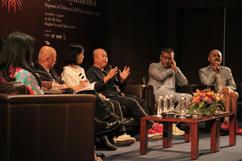แพทริค ซัน ,ผู้ก่อตั้งมูลนิธิซันไพรด์ และ นักสะสมงานศิลปะ “มูลนิธิซันไพรด์ มุ่งมั่นดำเนินการสนับสนุน และส่งเสริมเรื่องราวของกลุ่มความหลากหลายทางเพศ (LGBTQ) ที่อุดมไปด้วยความคิดสร้างสรรค์ และยังผลักดันและสร้างแรงบันดาลใจให้กับศิลปินรุ่นใหม่ ในการสร้างสรรค์ทัศนะเชิงบวกต่อประสบการณ์ชีวิตของกลุ่ม LGBTQ ผ่านการจัดแสดงนิทรรศการและอนุรักษ์ศิลปะสู่สังคมในวงกว้าง ครั้งนี้เรายินดีที่ได้ร่วมงานกับหอศิลปวัฒนธรรมแห่งกรุงเทพมหานคร จัดงานนิทรรศการ SPECTROSYNTHESIS II – Exposure of Tolerance: LGBTQ in Southeast Asia ขึ้นที่กรุงเทพมหานคร เมืองซึ่งขึ้นชื่อว่าเป็นมิตรกับสมาชิกลุ่ม LGBTQ อย่างยิ่ง โดยคณะรัฐมนตรีของประเทศไทยได้เห็นชอบร่างพระราชบัญญัติคู่ชีวิต ซึ่งนับเป็นสัญญาณที่ดีต่อการให้สิทธิสมรสที่เท่าเทียมกันในอนาคต”…